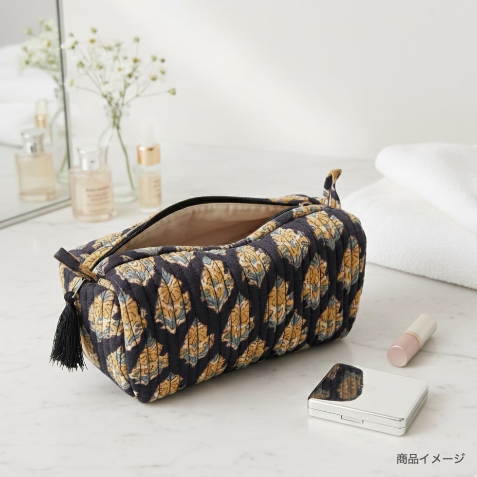黒地にフラワープリントが映え、落ち着いた表情ながらも存在感のあるハンドプリントのコスメポーチ。職人による丁寧な手仕事で生み出された、やさしい色合いと柄。使う程に愛着が湧いてくる、そんなアイテムです。