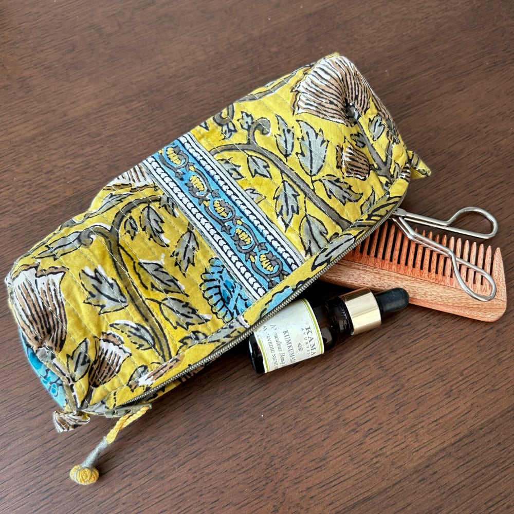 ブロックプリントの本場、インドのジャイプール地方で作られたペンケース型ポーチ。職人の手仕事ならではの、美しく上品で、ぬくもりの感じられるプリントが目を惹きます。