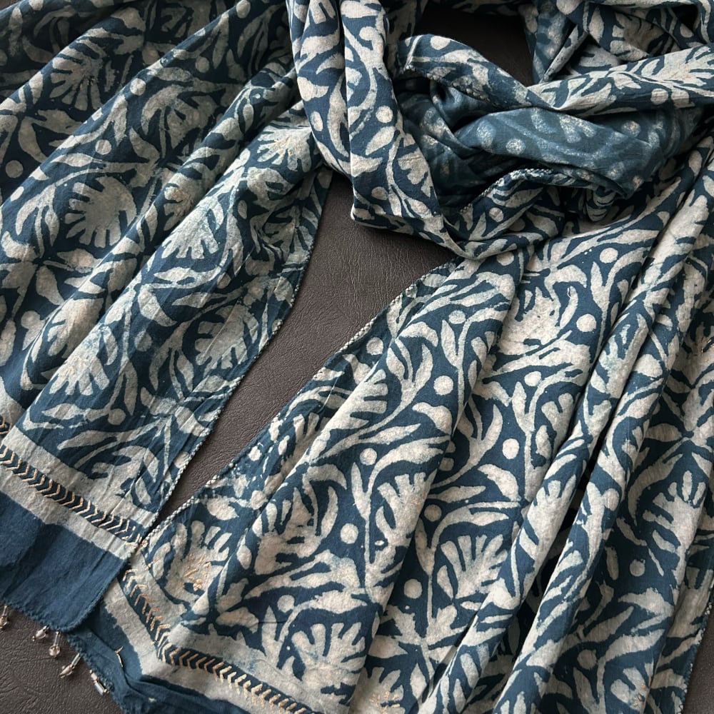 落ち着いたインディゴカラーに白地のフラワープリントが映えるコットンストール。