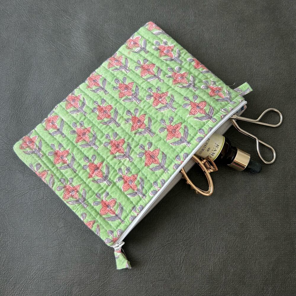 フラットポーチ ブロックプリント コットンポーチ オリーブ