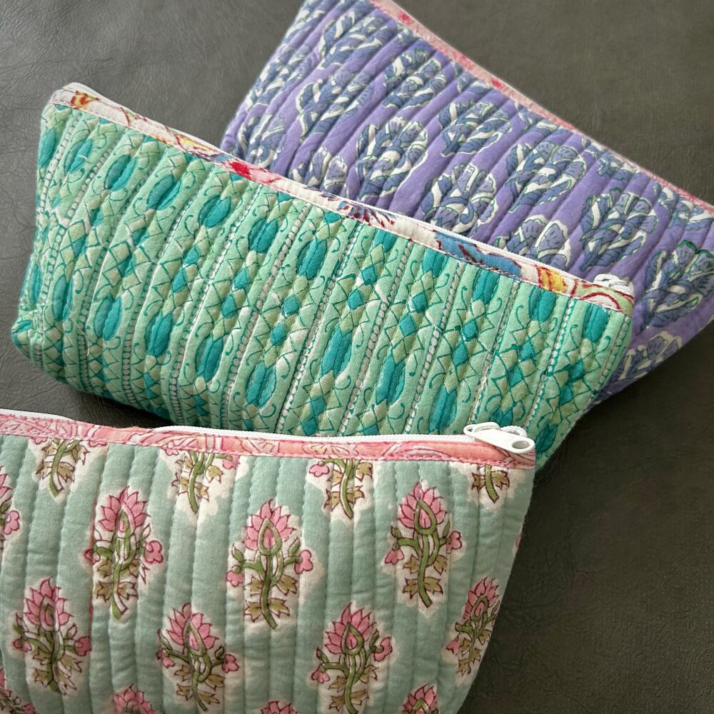 優しい色味と上品な柄が魅力のブロックプリントポーチ。職人による丁寧な手仕事で生み出された、やさしい色合いと柄。使う程に愛着が湧いてくる、そんなアイテムです。