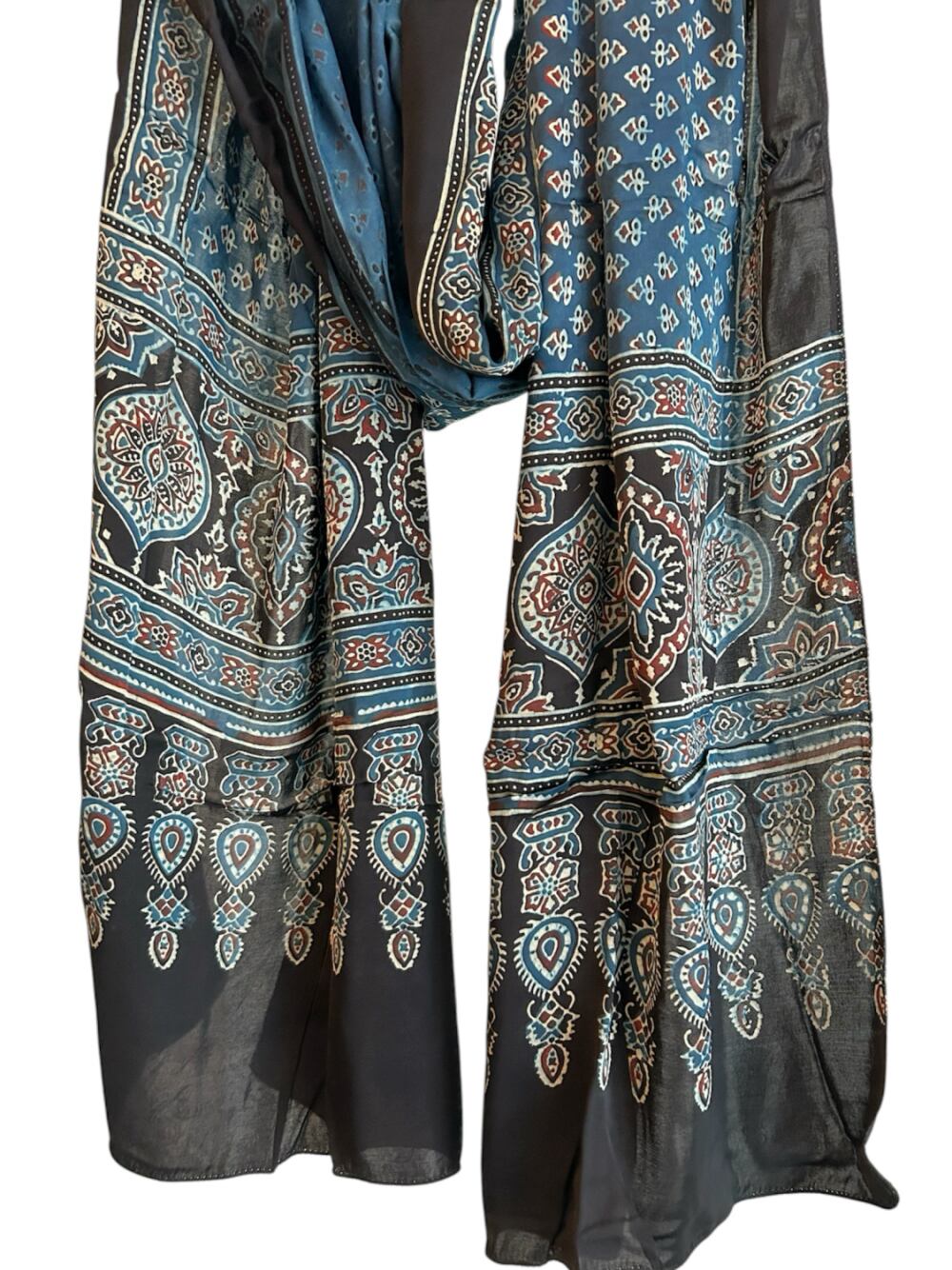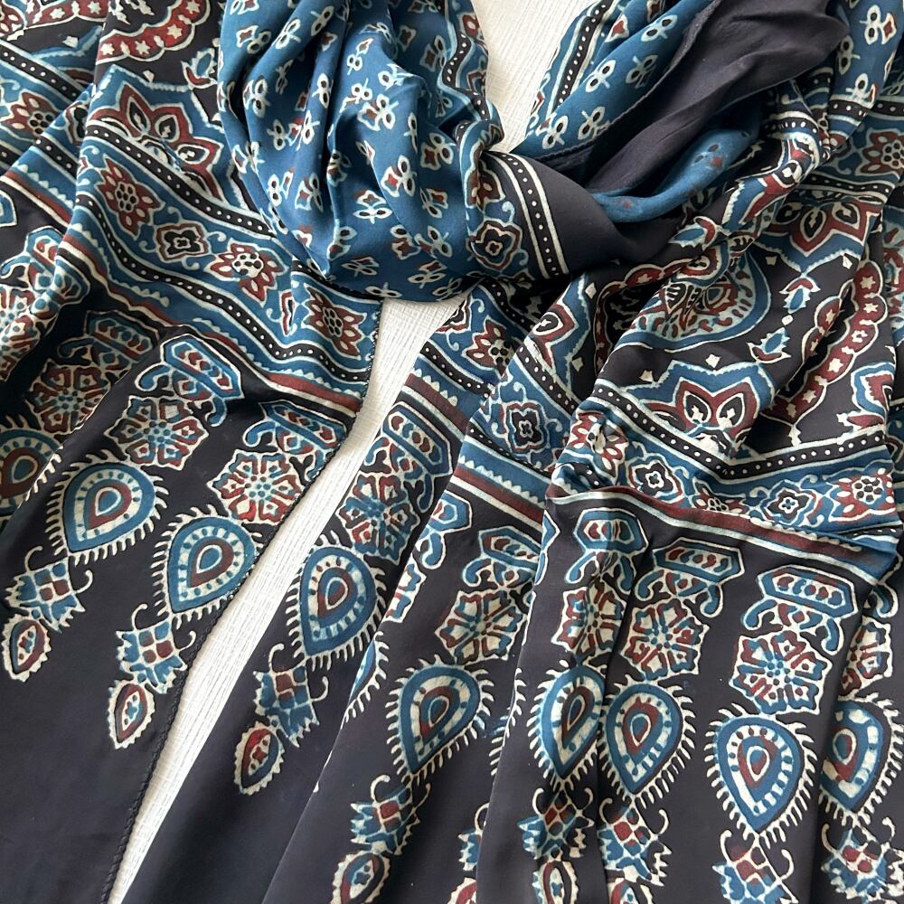 特に天然染料が生み出す深い青色と赤色の色彩が特徴的で、伝統的なAjrakhプリントの象徴とされています。シンプルなコーディネートに合わせるだけで、優雅な装いに。冷房対策はもちろん、寒い時にも活躍してくれる、季節を問わず使えるアイテムです。