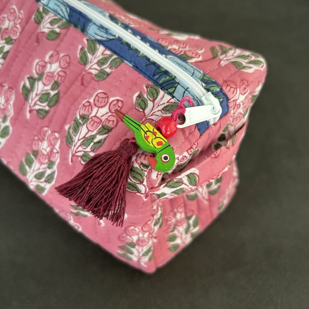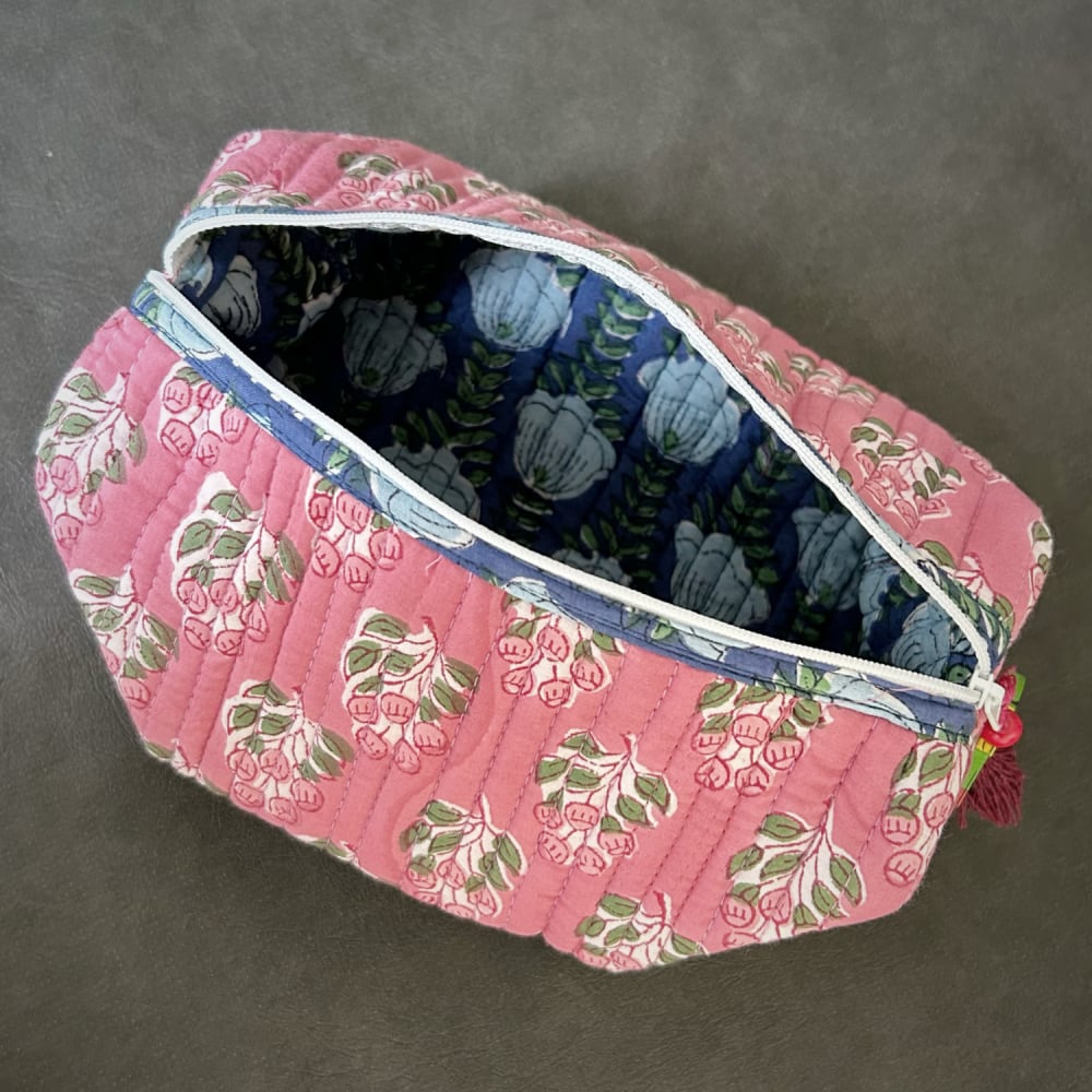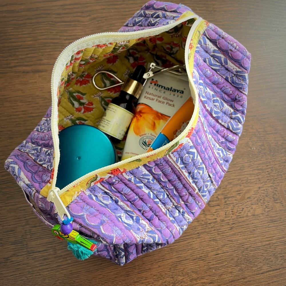 内布には、異なる柄のブロックプリント生地を使用。ジッパーを開ければ、表地とは異なる色彩を楽しむことができます。