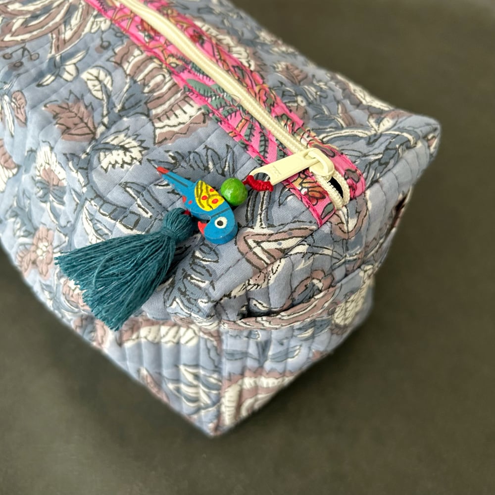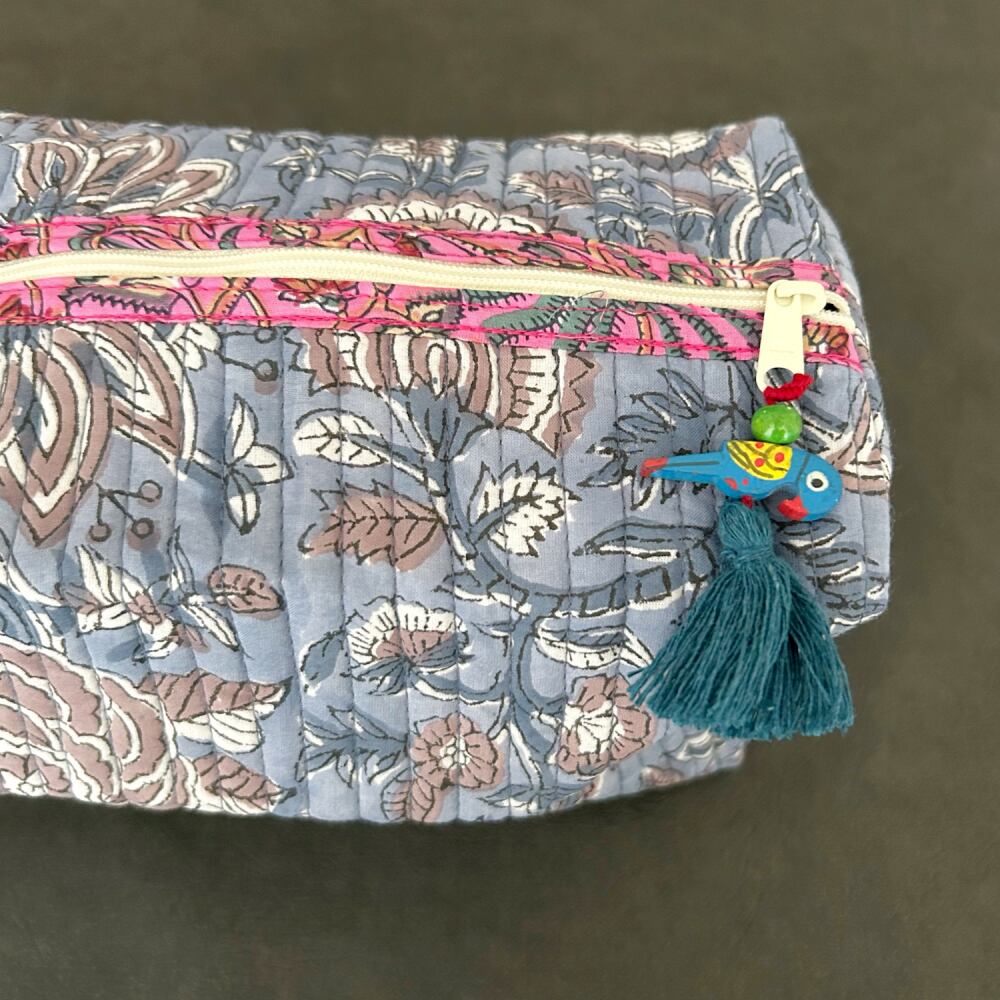内布には、異なる柄のブロックプリント生地を使用。ジッパーを開ければ、表地とは異なる色彩を楽しむことができます。