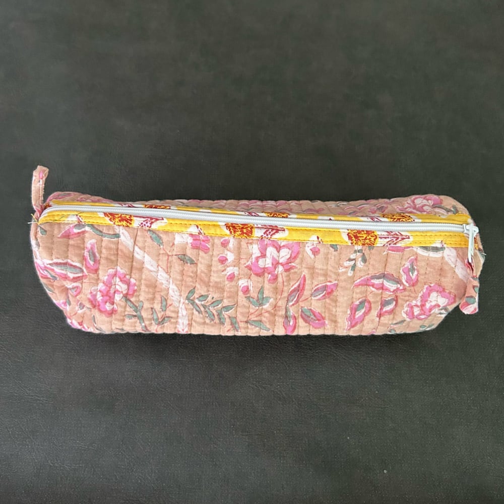 内布には、異なる柄のブロックプリント生地を使用。ジッパーを開ければ、表地とは異なる色彩を楽しむことができます。ペンケースとしてはもちろん、化粧ポーチや旅行用ポーチとしても最適です。