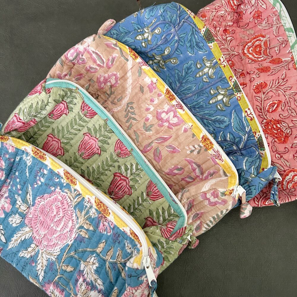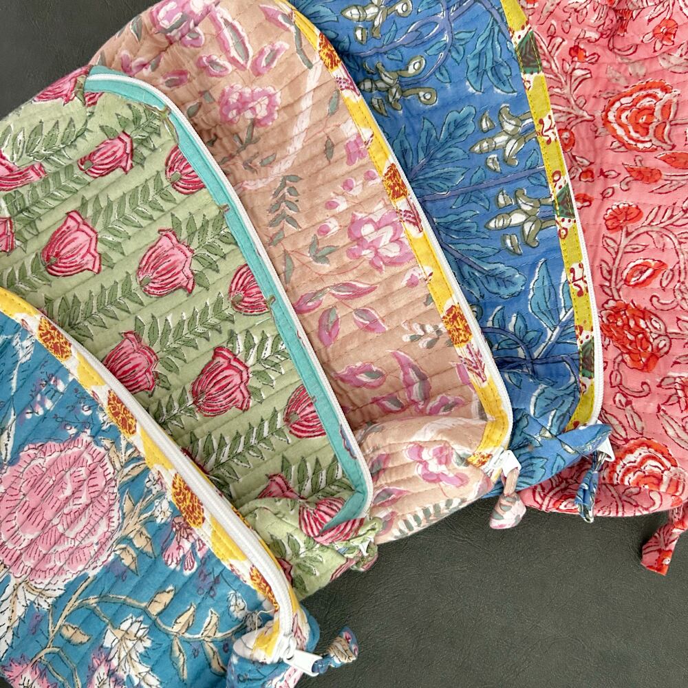 かわいいフラワープリントが映えるブロックプリントポーチ。職人による丁寧な手仕事で生み出された、やさしい色合いと柄。使う程に愛着が湧いてくる、そんなアイテムです。