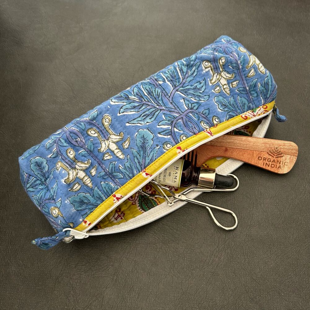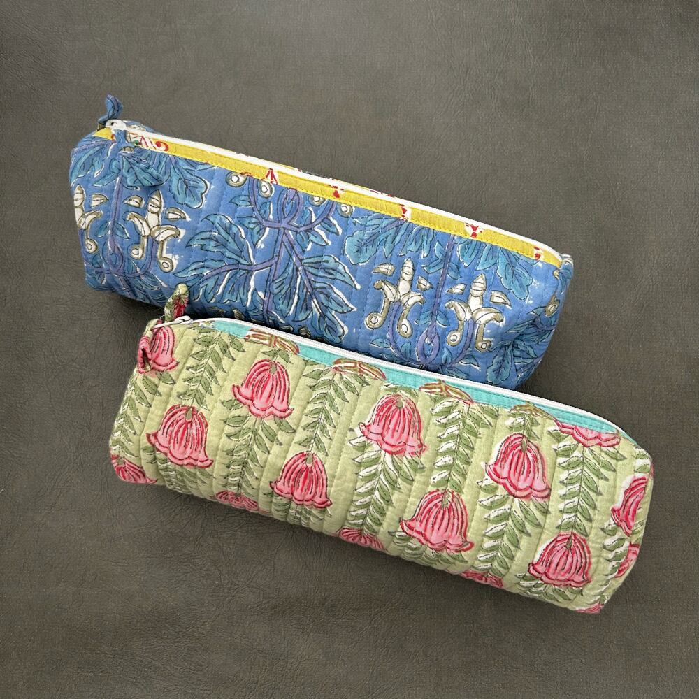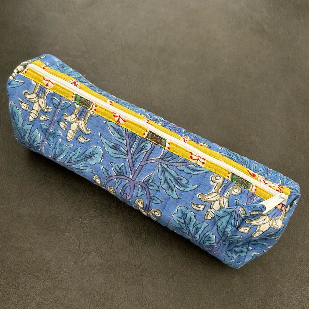 内布には、異なる柄のブロックプリント生地を使用。ジッパーを開ければ、表地とは異なる色彩を楽しむことができます。ペンケースとしてはもちろん、化粧ポーチや旅行用ポーチとしても最適です。