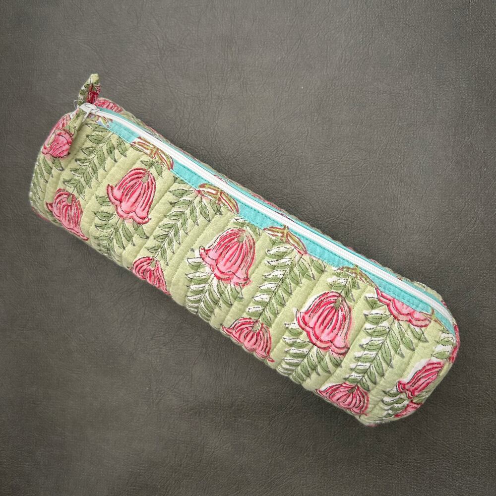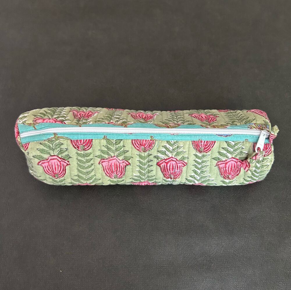 内布には、異なる柄のブロックプリント生地を使用。ジッパーを開ければ、表地とは異なる色彩を楽しむことができます。ペンケースとしてはもちろん、化粧ポーチや旅行用ポーチとしても最適です。