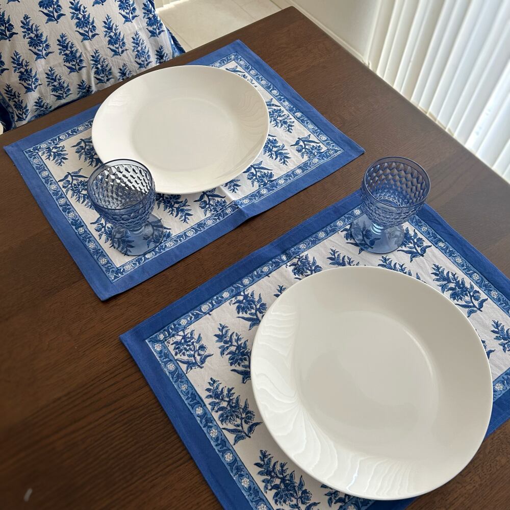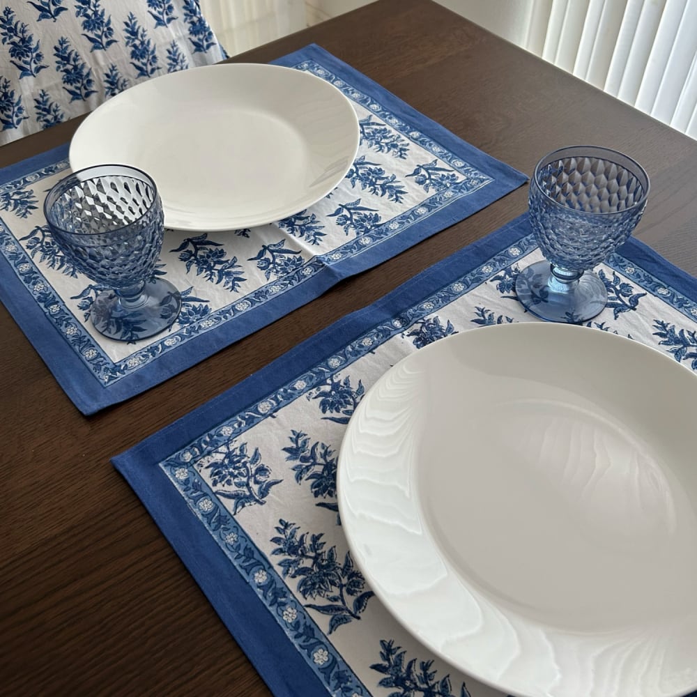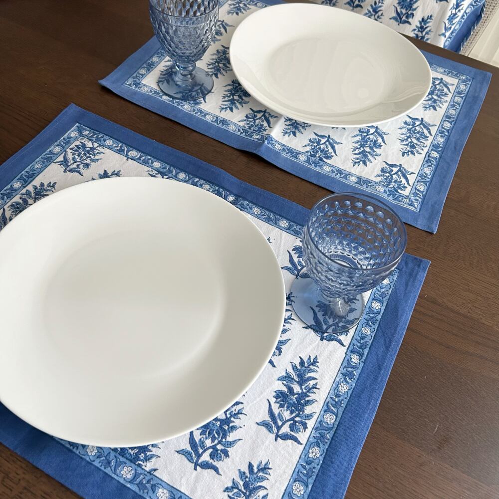 ブロックプリントの本場、インドのジャイプール地方で作られたランチョンマット。インドらしい色合いと上品な柄が、ダイニングテーブルを一瞬で華やかにしてくれます。落ち着いた色彩で高級感あるデザインに仕上がっており、いつもの食卓がパッと明るくなります。