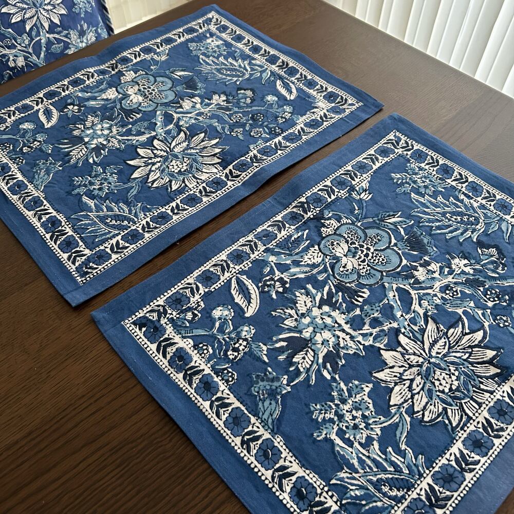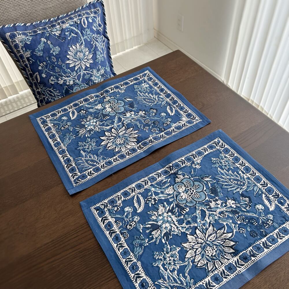 ブロックプリントの本場、インドのジャイプール地方で作られたランチョンマット。インドらしい色合いと上品な柄が、ダイニングテーブルを一瞬で華やかにしてくれます。落ち着いた色彩で高級感あるデザインに仕上がっており、いつもの食卓がパッと明るくなります。