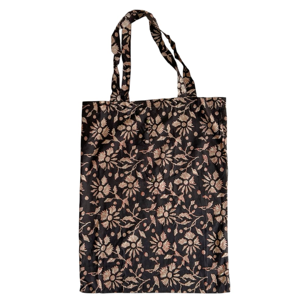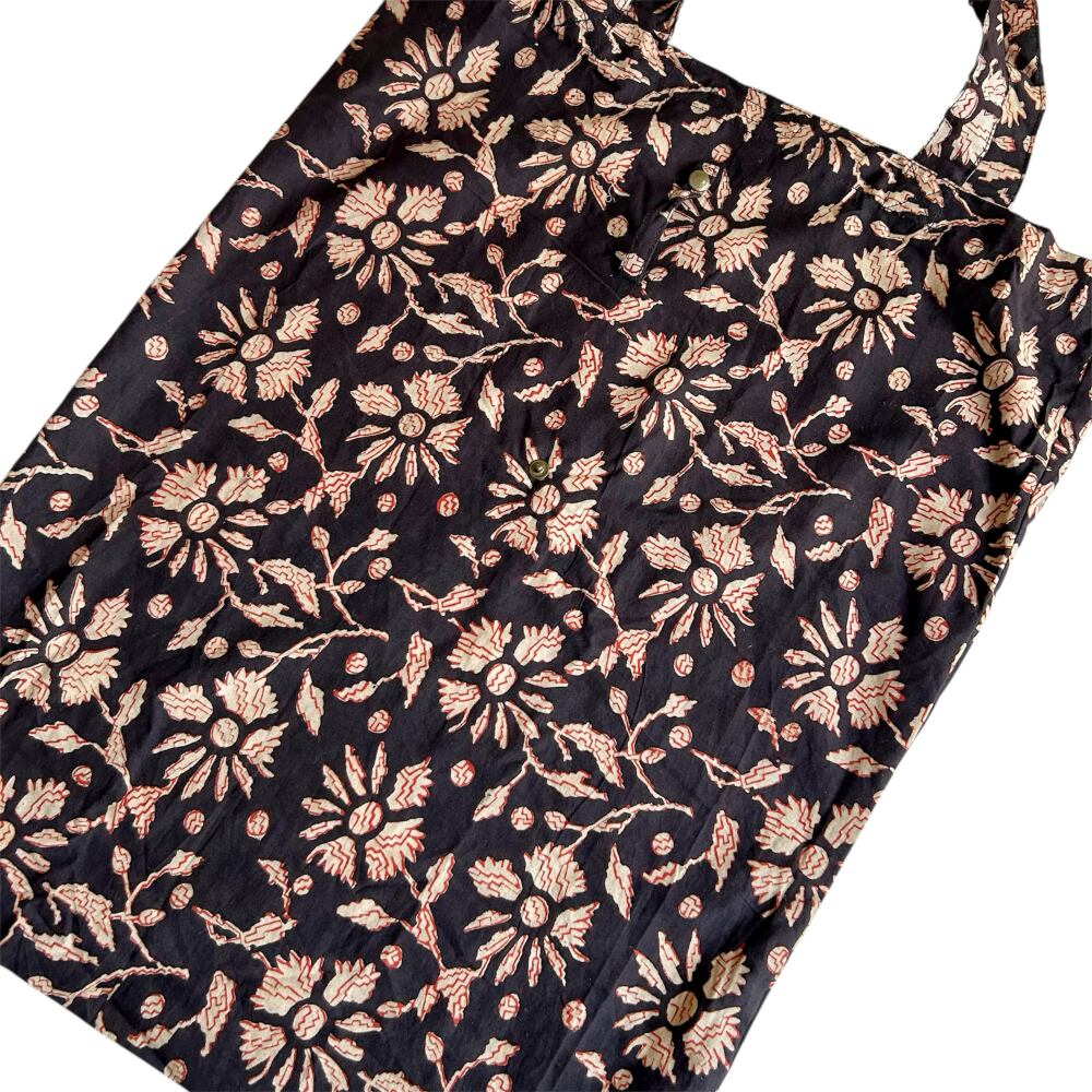 ブラックカラーにベージュのフラワープリントが映える、おしゃれなコットンエコバッグ。どんな装いにもマッチする、使いやすい柄です。