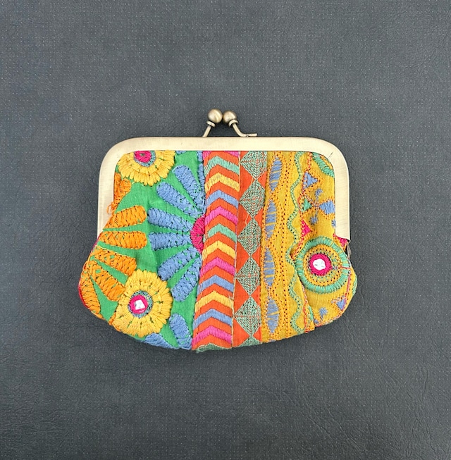 表と裏、両側に鮮やかな刺繍が施された、贅沢なポーチ。ミラーワークなど様々な刺繍テクニックが詰め込まれた1点もの。手仕事ならではの温かみが感じられるアイテムです。普段使いはもちろんですが、特別な日に使いたいと思わせるおしゃれなデザインに仕上がっています。