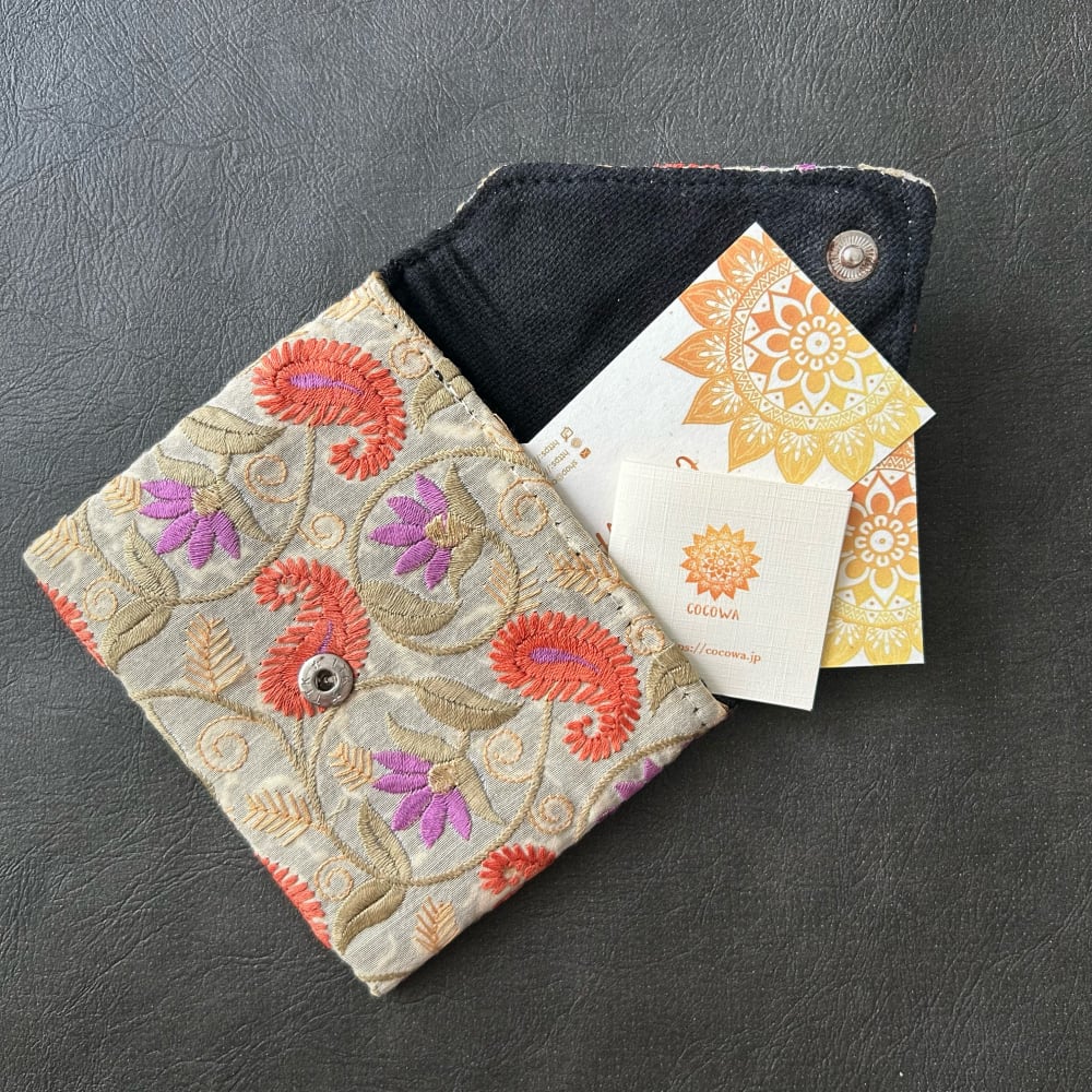 インド西部グジャラート州・カッチ地方の伝統刺繍を用いた、手のひらサイズのミニポーチ。