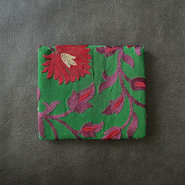 小ぶりながらも存在感のあるデザイン。鮮やかな花模様や細やかな刺繍は、バッグから取り出すたびに気持ちを和らげてくれます。ミラー刺繍など様々な技法が使われ、見れば見るほど、その細やかさに驚かされます。内側には黒の裏地を合わせ、華やかな色合いを一層引き立てています。