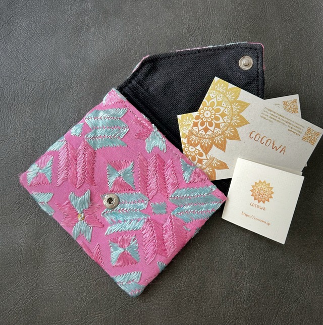 インド西部グジャラート州・カッチ地方の伝統刺繍を用いた、手のひらサイズのミニポーチ。