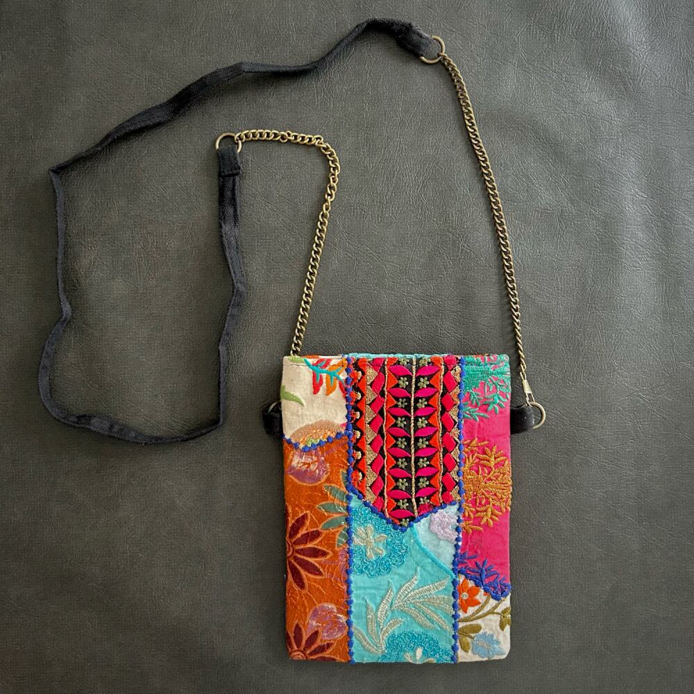 アップサイクルとは、単にリサイクルするだけではなく、その特性を生かしてより価値のあるものへと変えていくこと。サリーなどの美しい生地がパッチワークや刺繍によって、新たな魅力的な商品として生まれ変わっています。