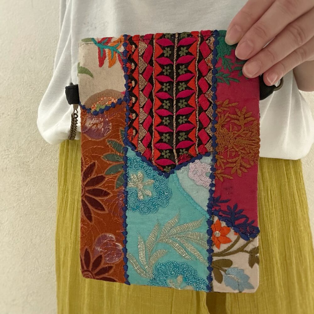 マチもなく携帯に便利なシンプルデザインですが、ゴージャスな刺繍がおしゃれなサコッシュ。