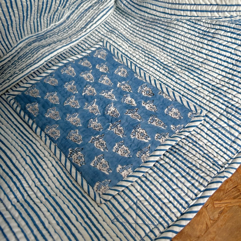 外側はインドの伝統的なブロックプリント生地で、オリエンタルな模様と洗練された色合いが魅力です。