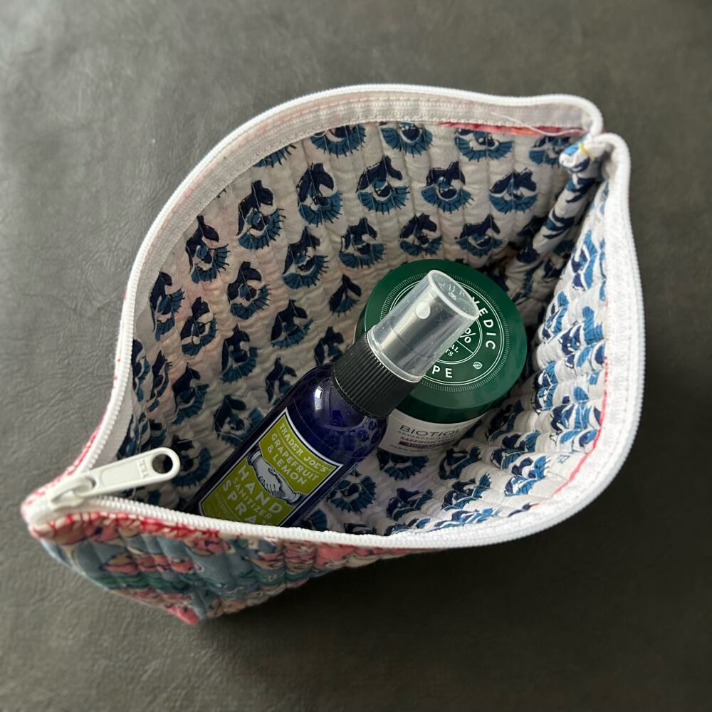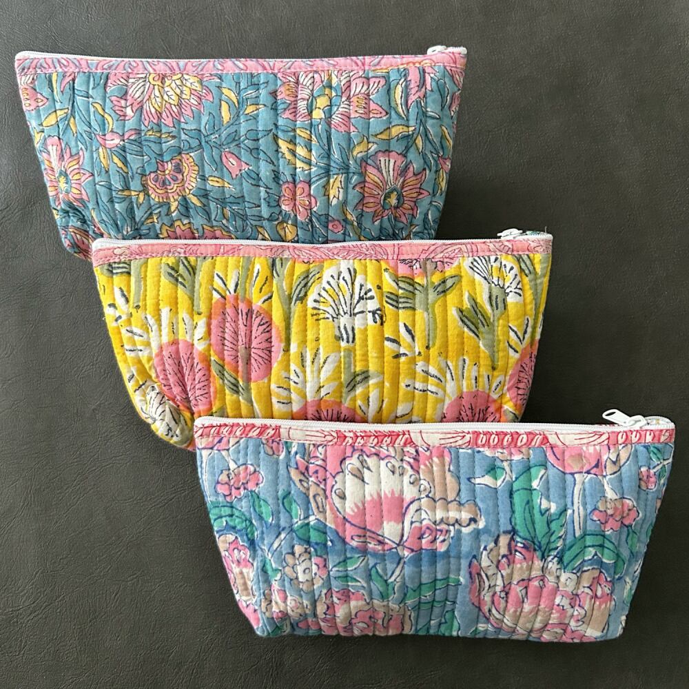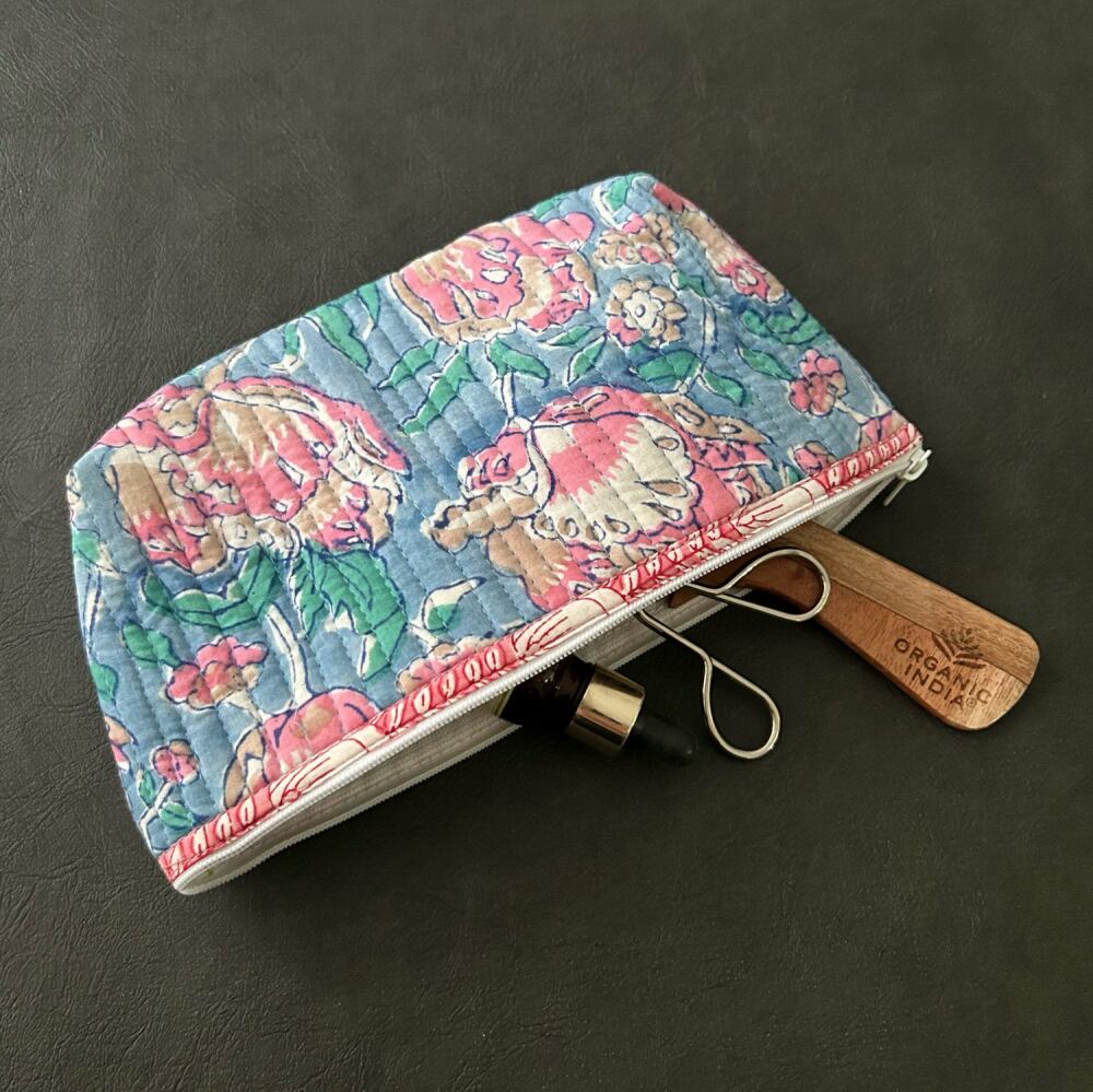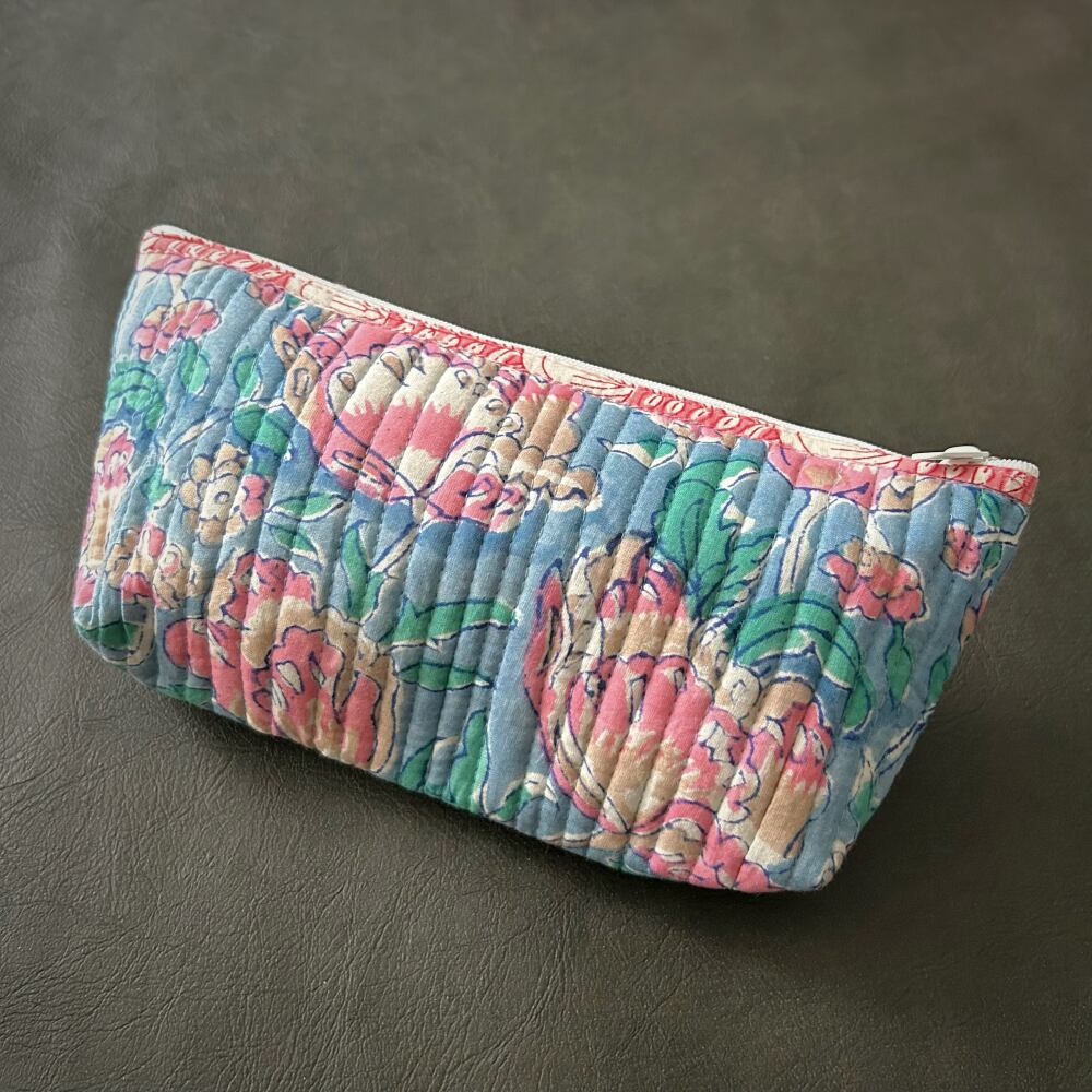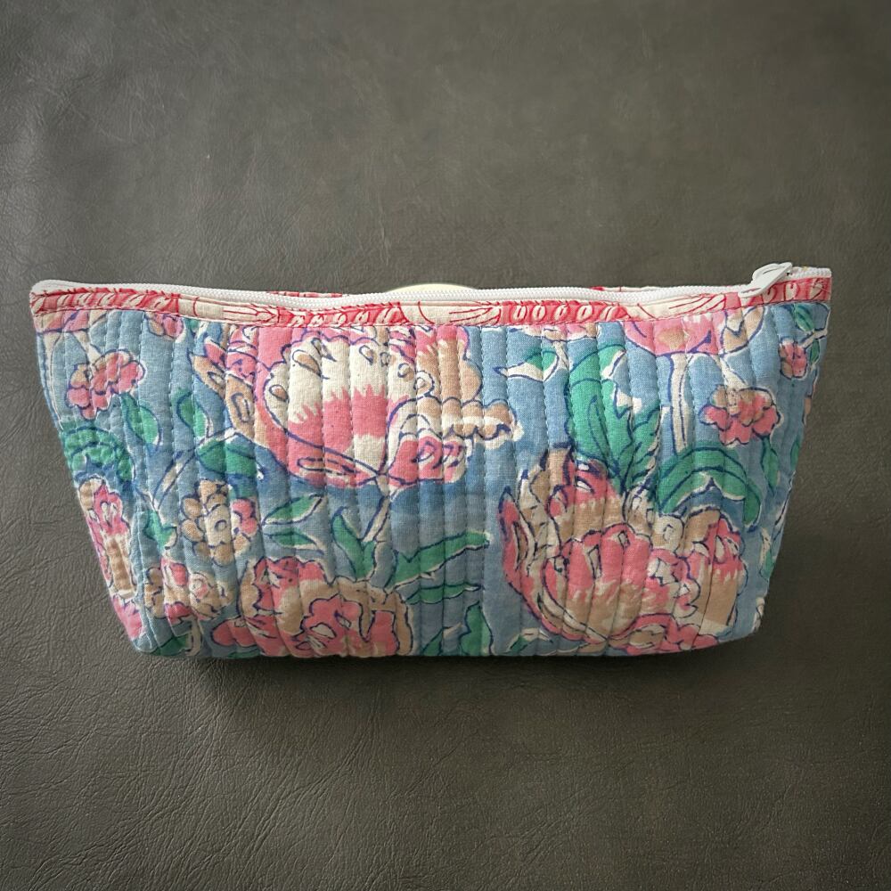 可愛いフラワープリントが魅力のブロックプリントポーチ。職人による丁寧な手仕事で生み出された、やさしい色合いと柄。使う程に愛着が湧いてくる、そんなアイテムです。