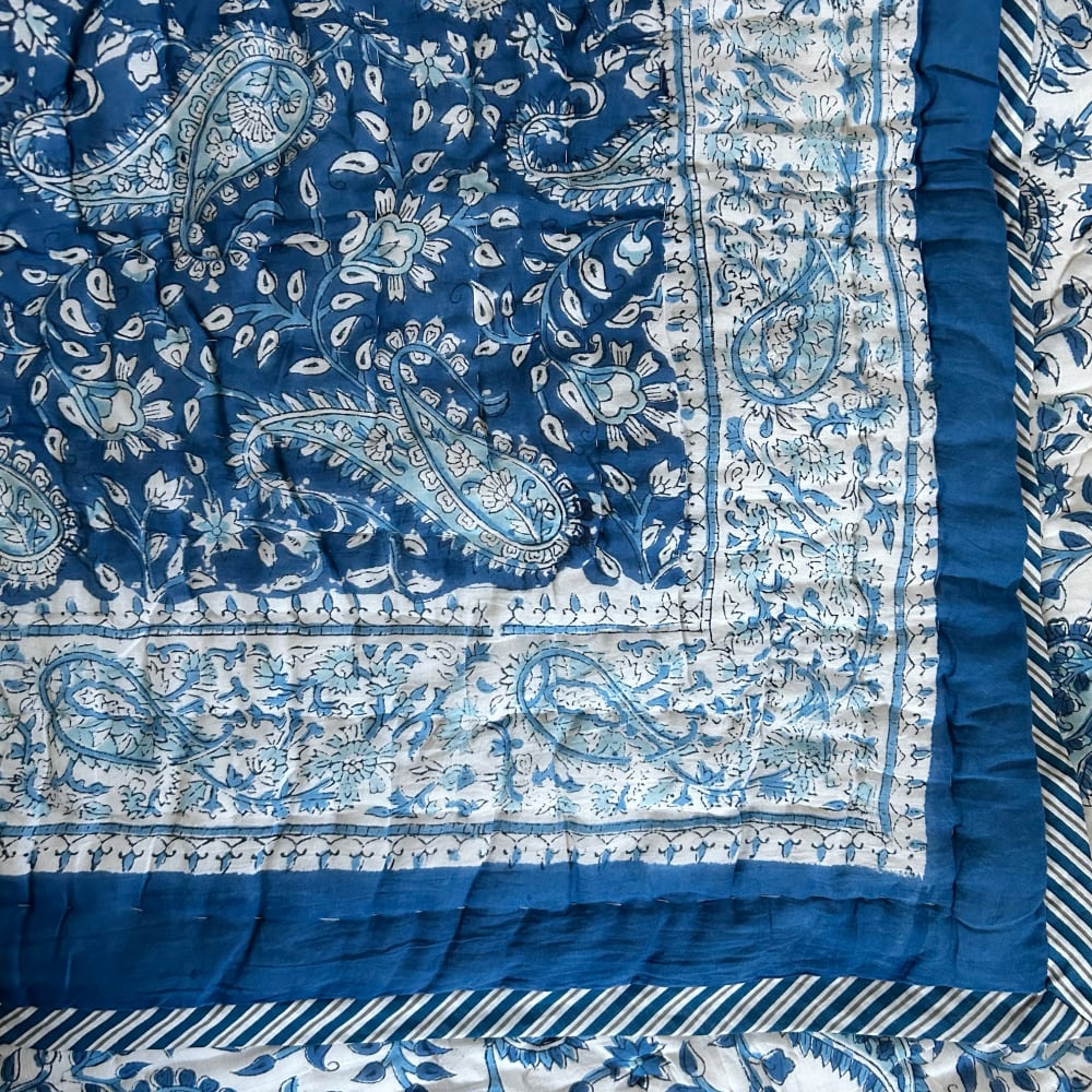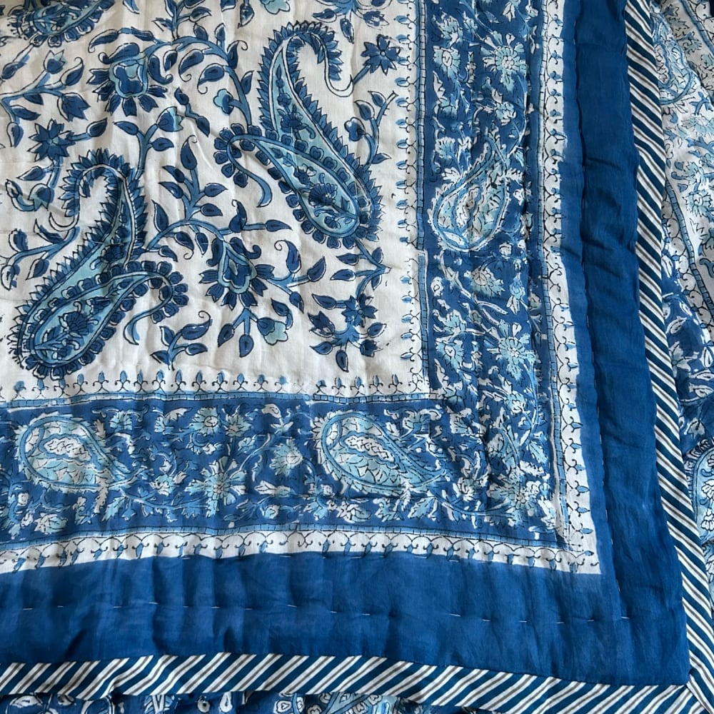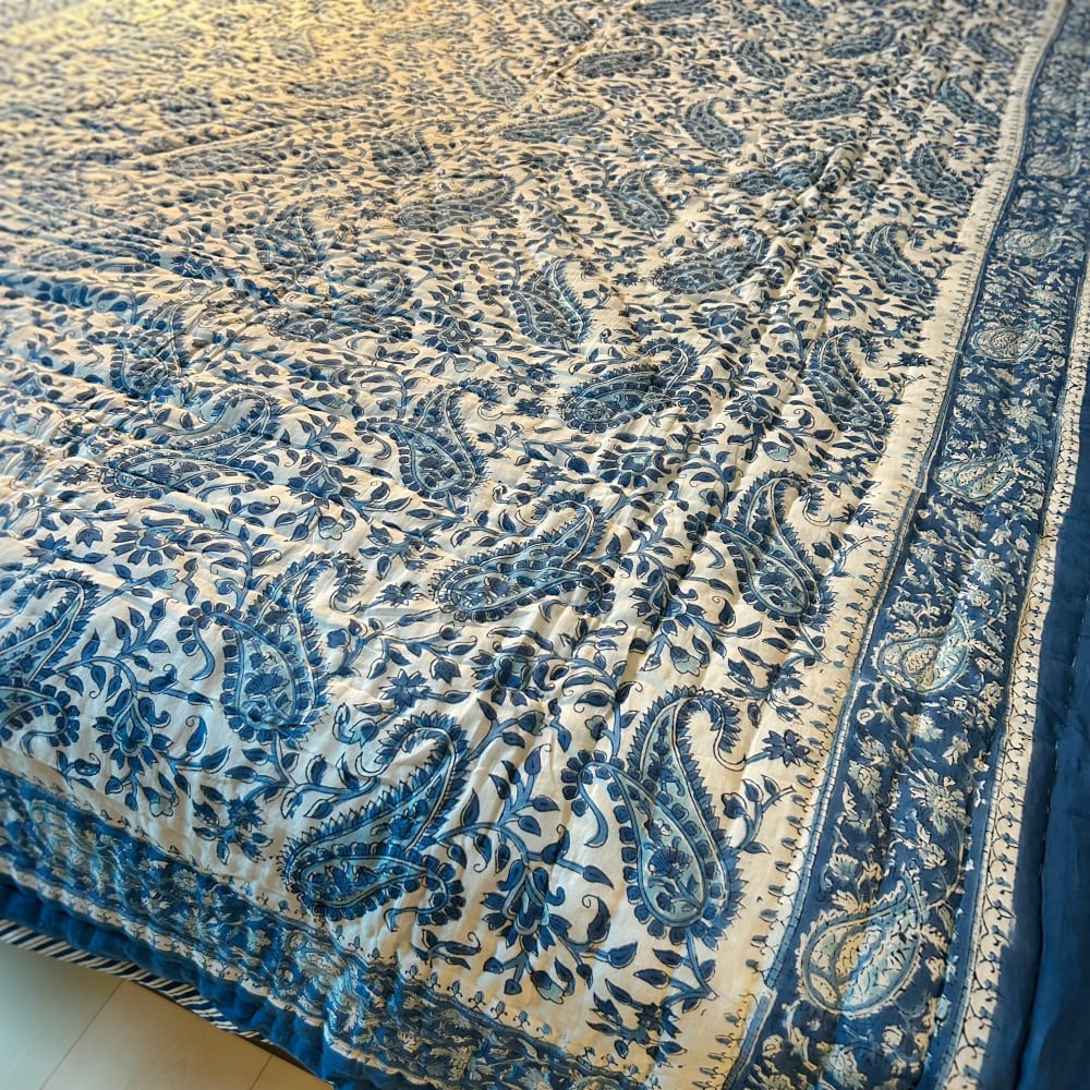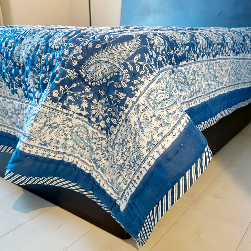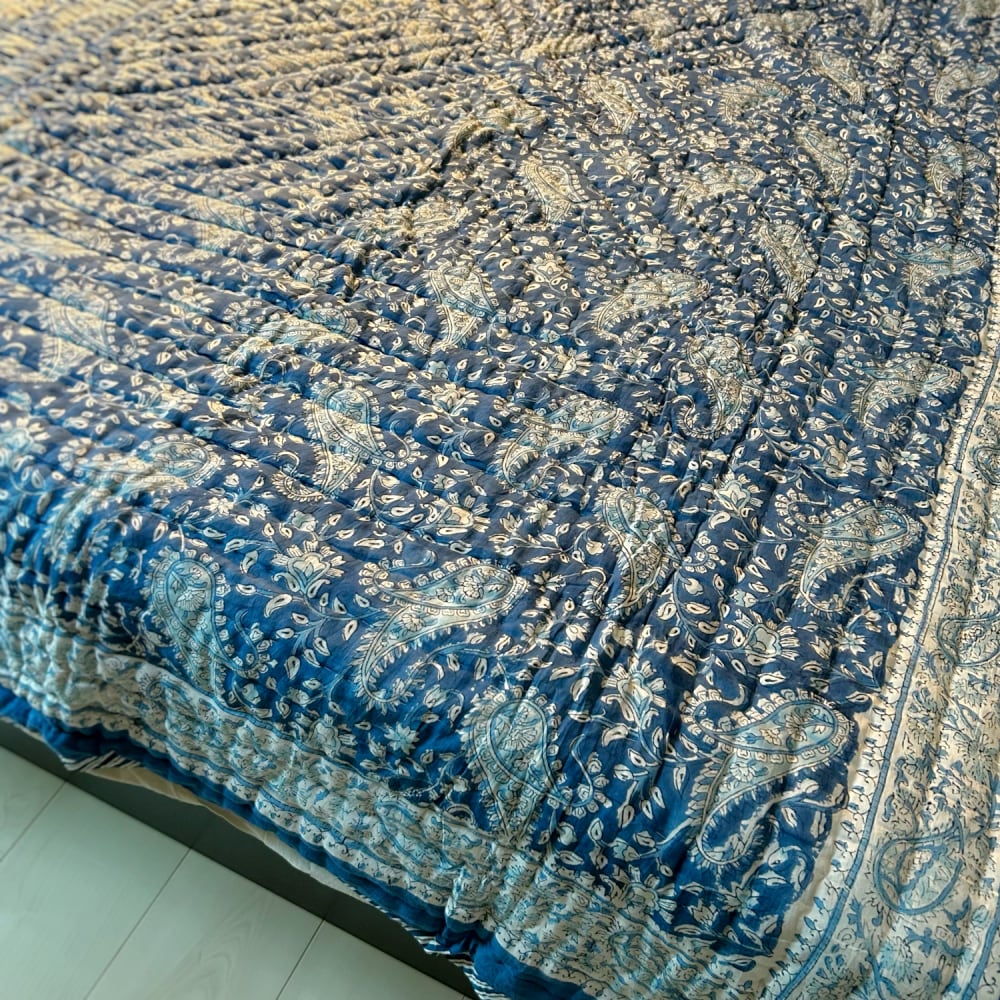 伝統的なブロックプリントで描かれた、繊細なペイズリー模様のコットンキルト。