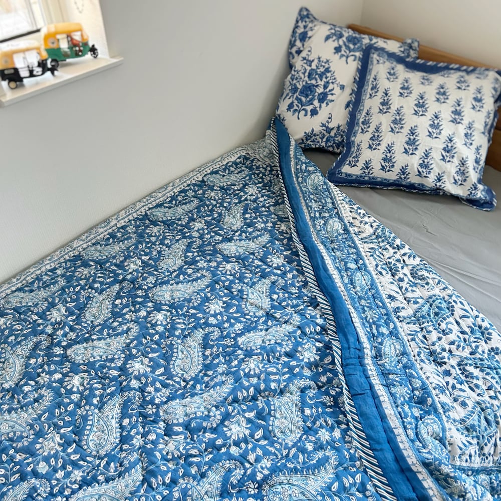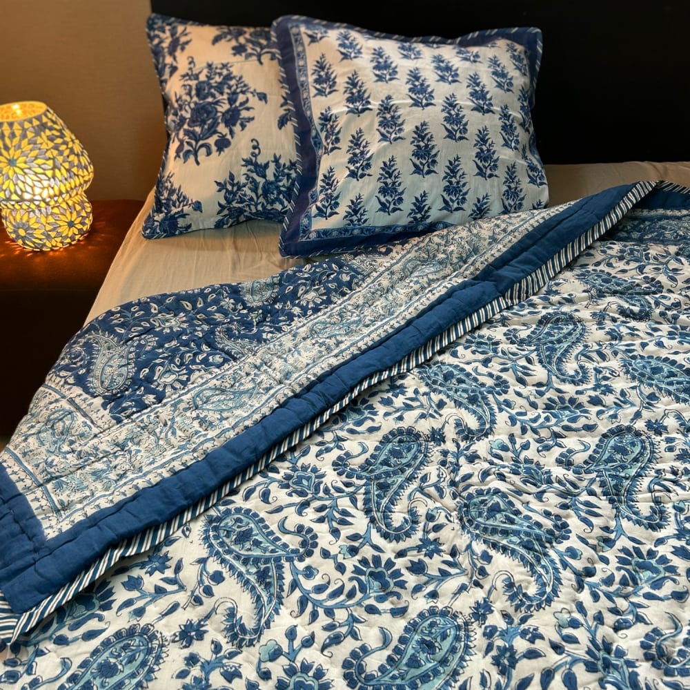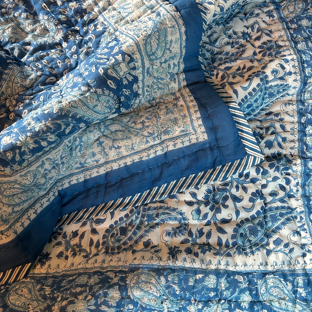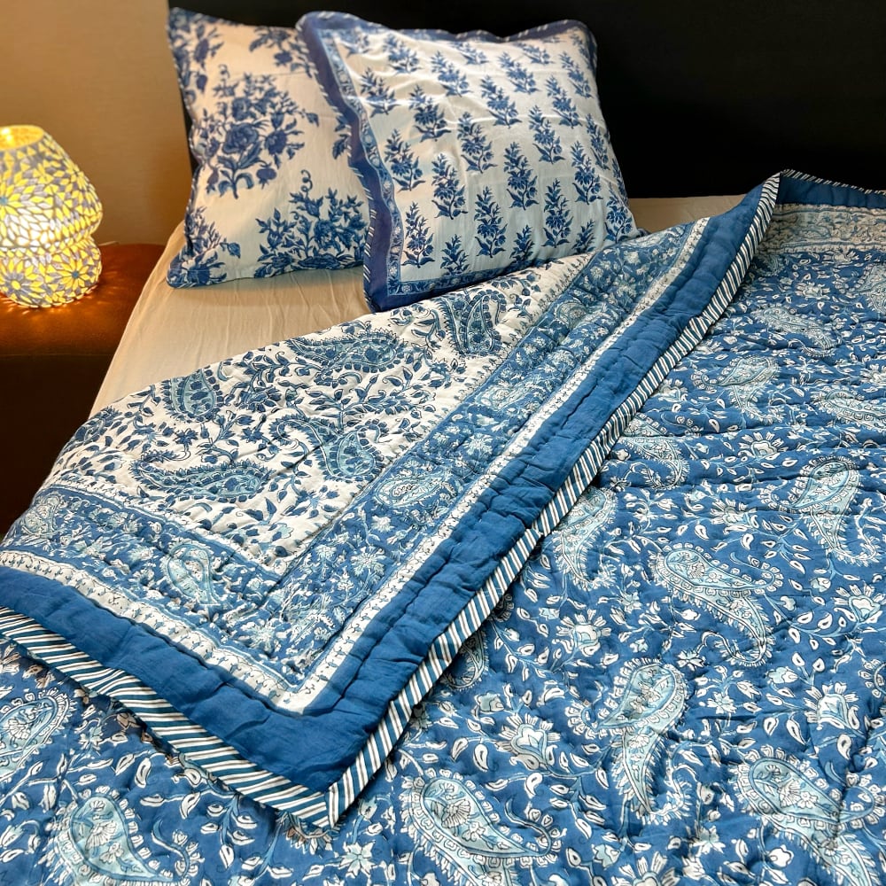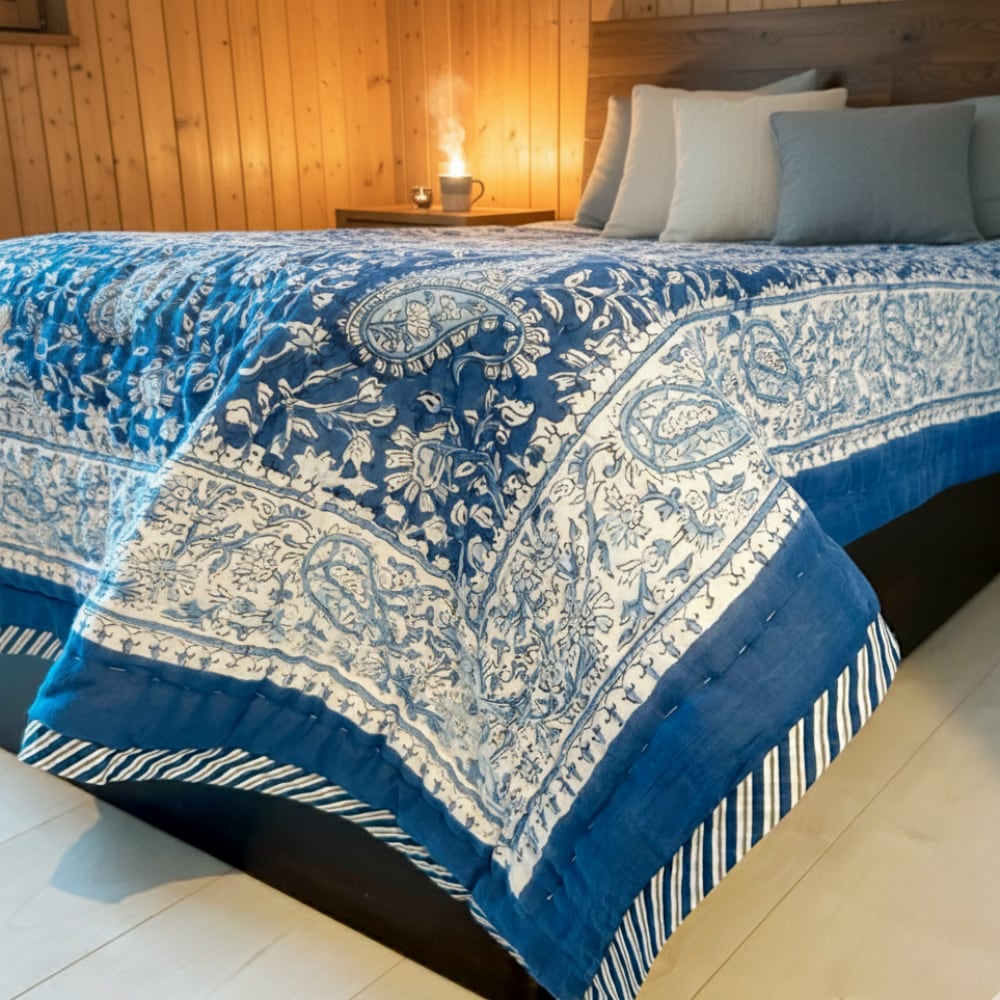 伝統的なブロックプリントで描かれた、繊細なペイズリー模様のコットンキルト。