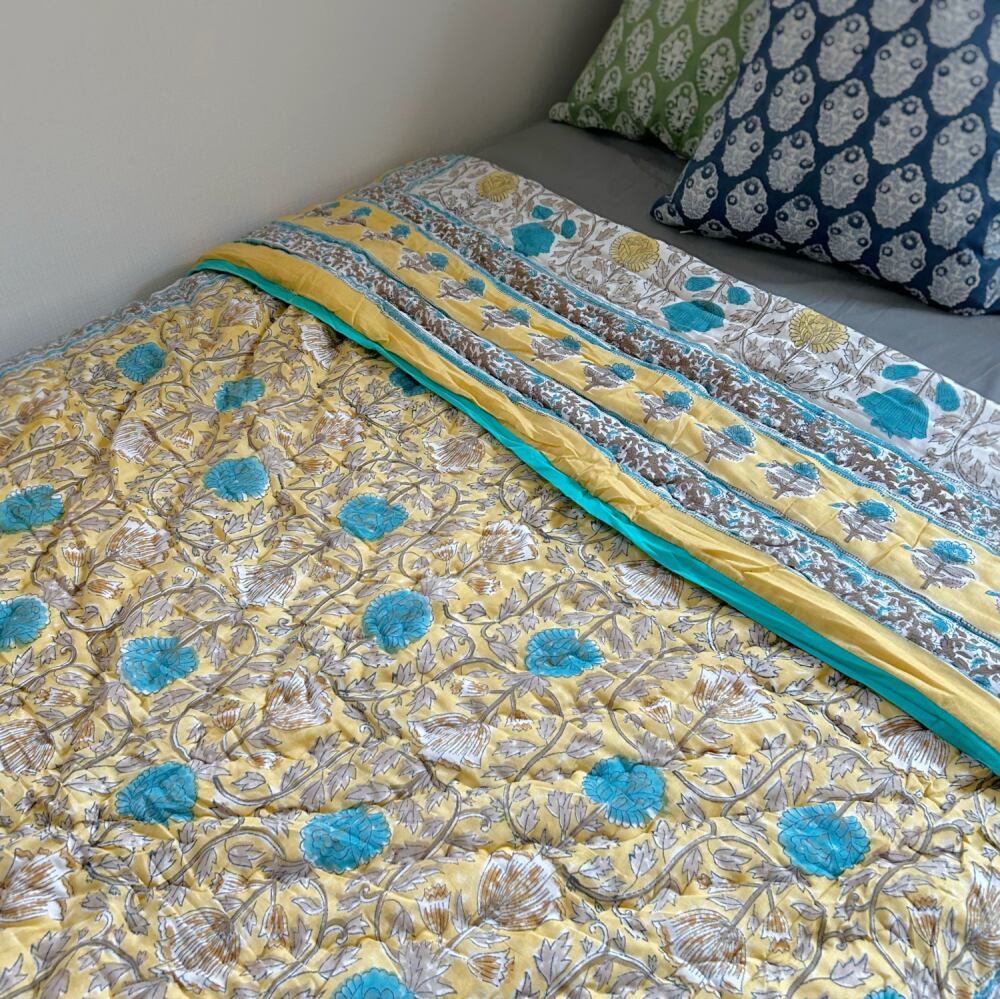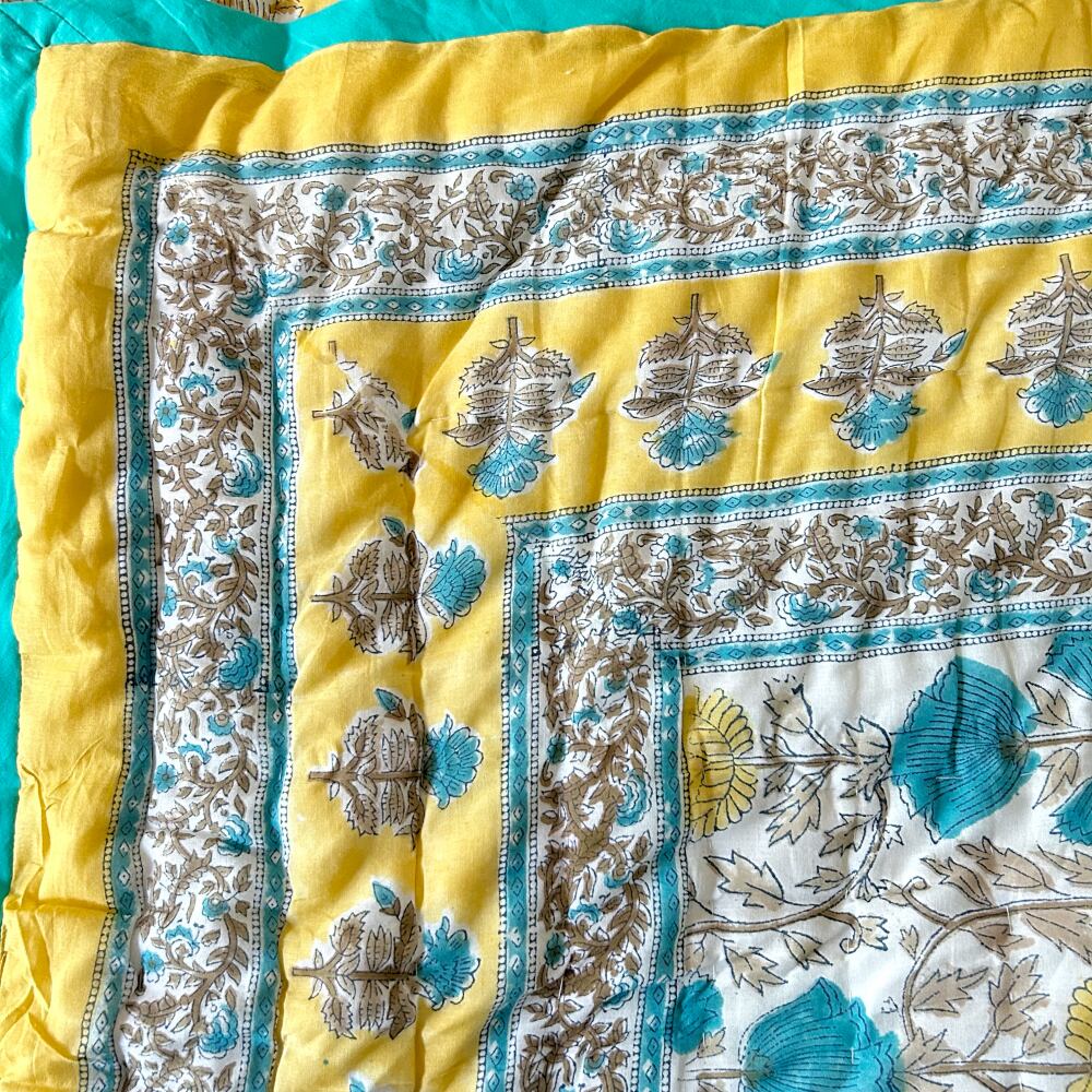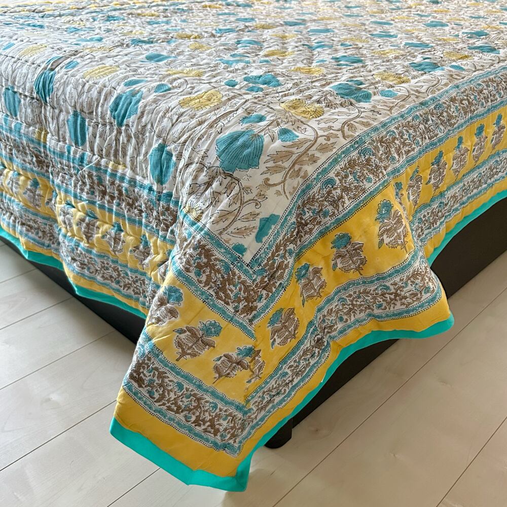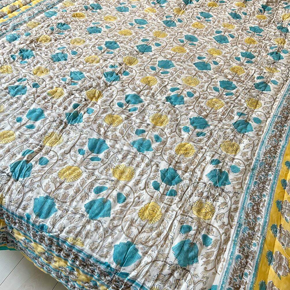 伝統的なブロックプリントで描かれた、繊細なペイズリー模様のコットンキルト。