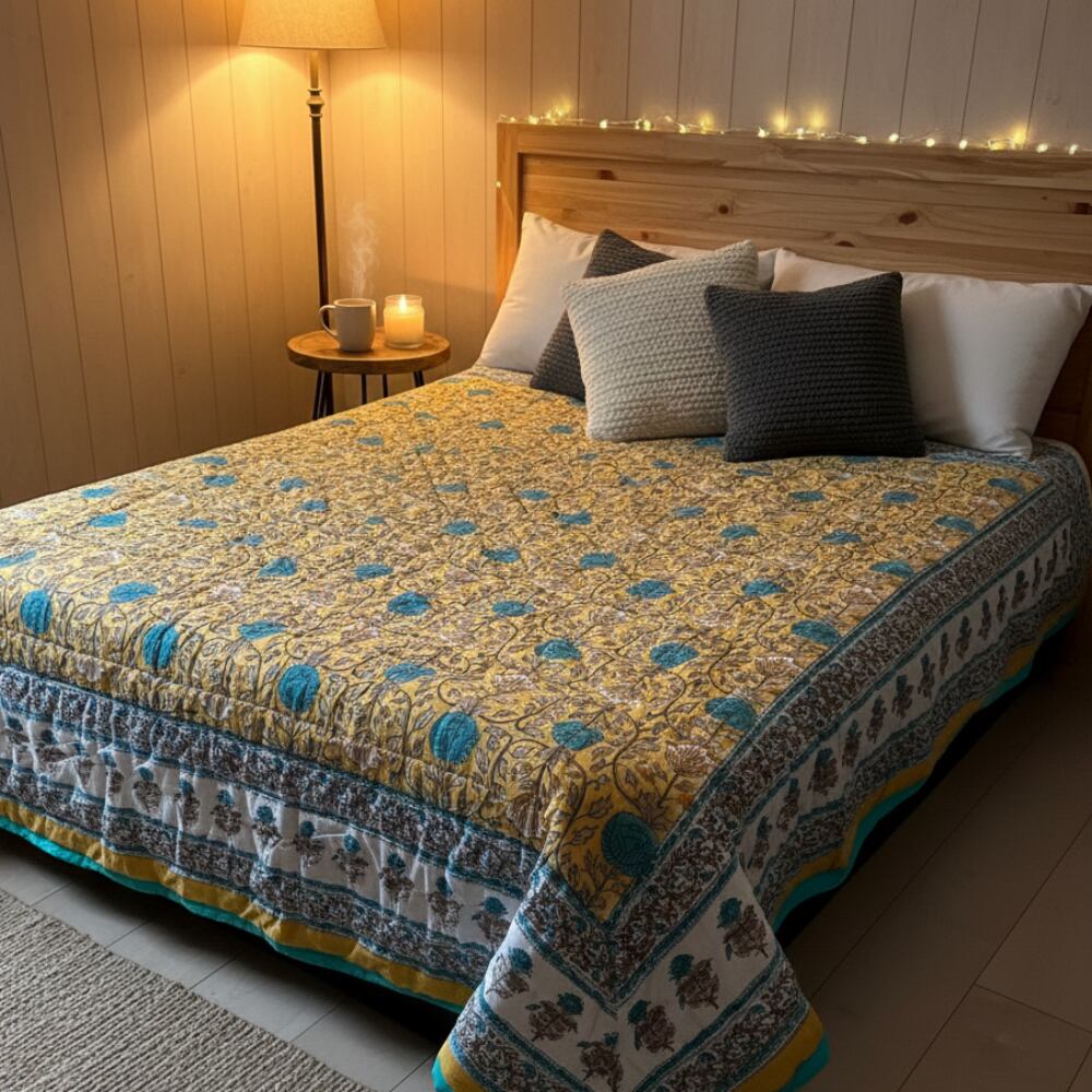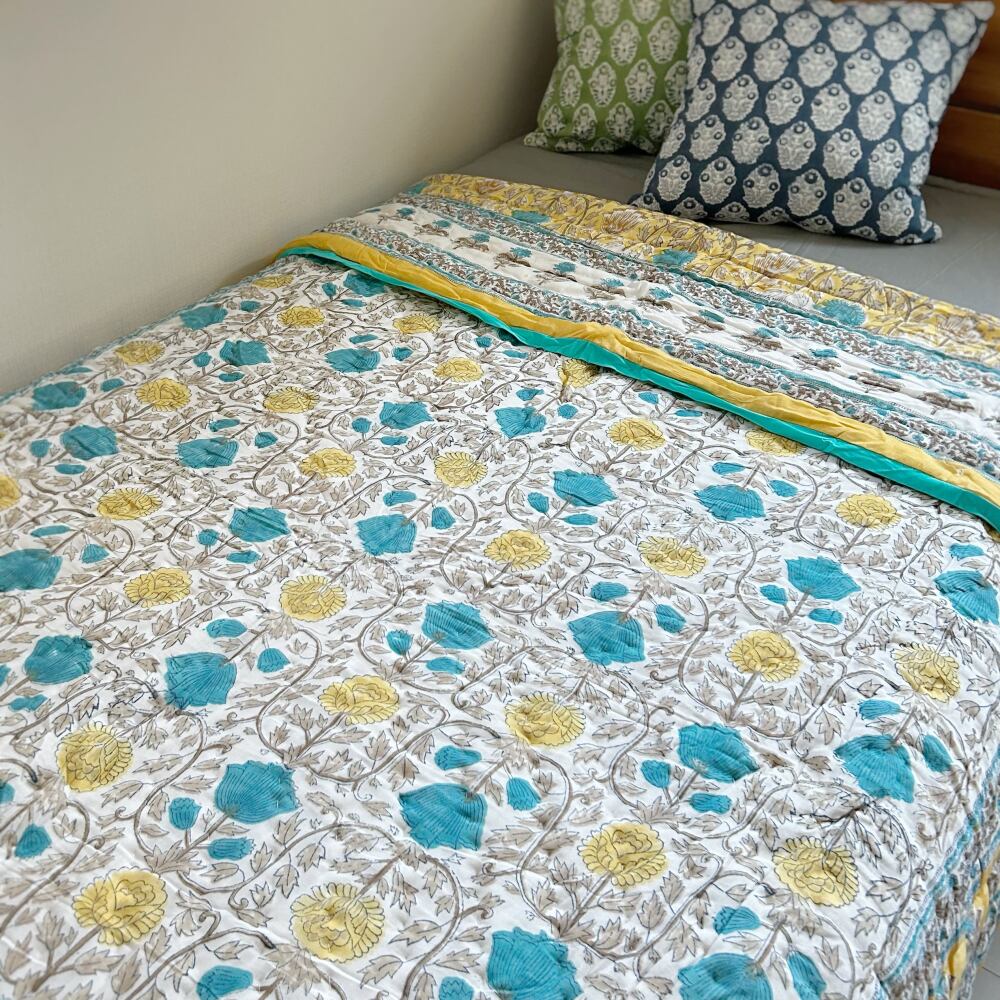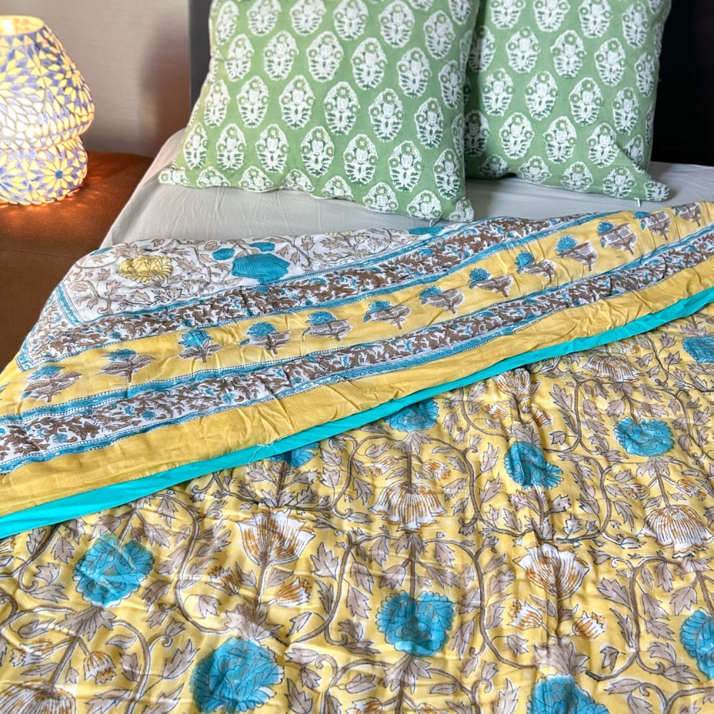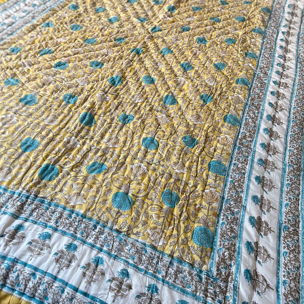 伝統的なブロックプリントで描かれた、繊細なペイズリー模様のコットンキルト。