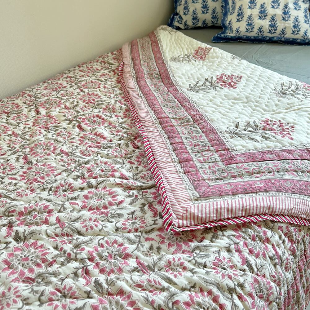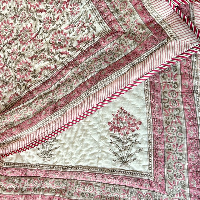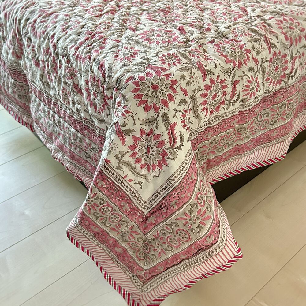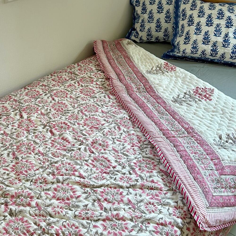 伝統的なブロックプリントで描かれた、繊細なペイズリー模様のコットンキルト。