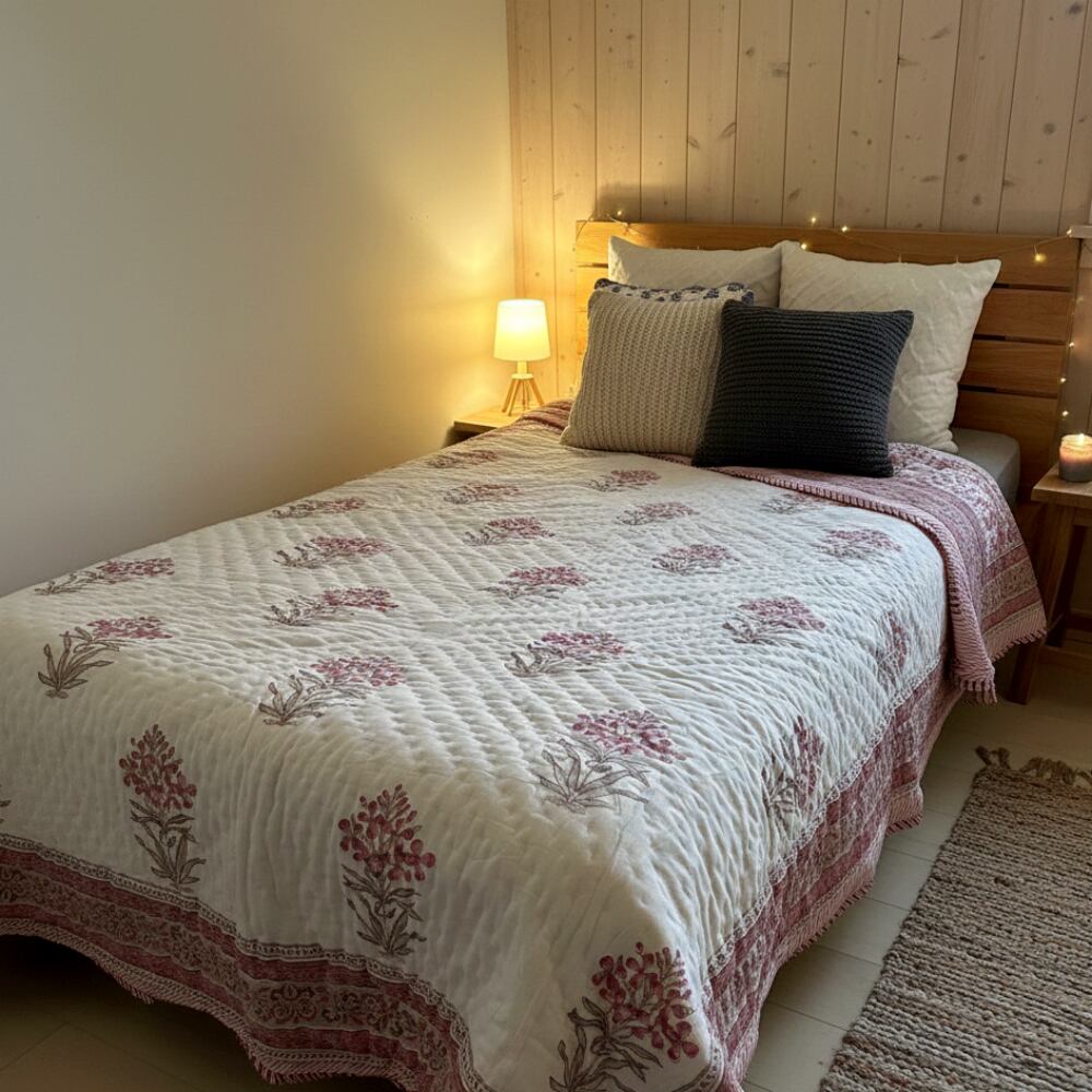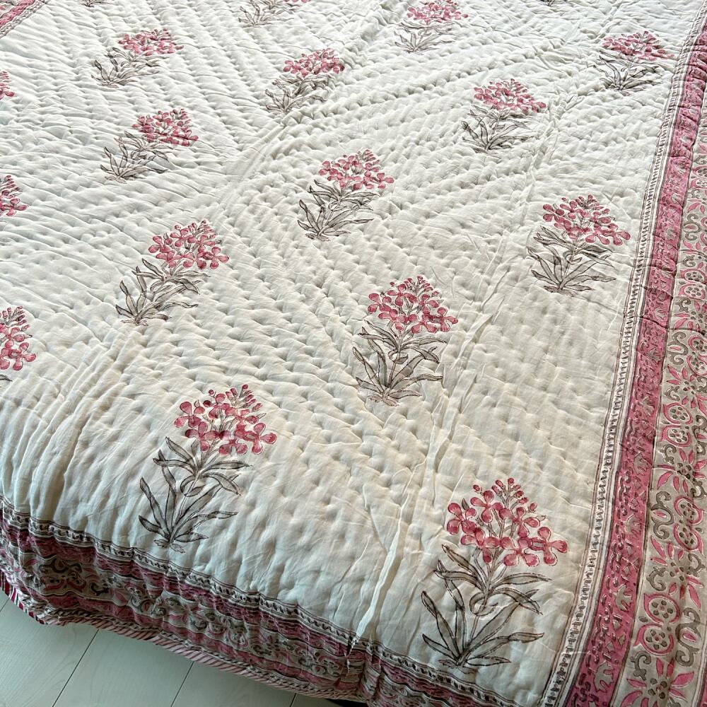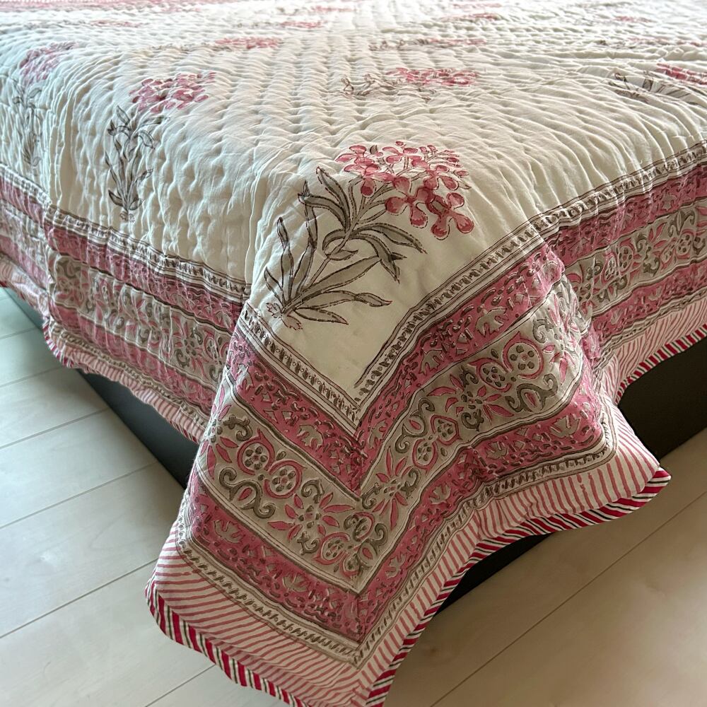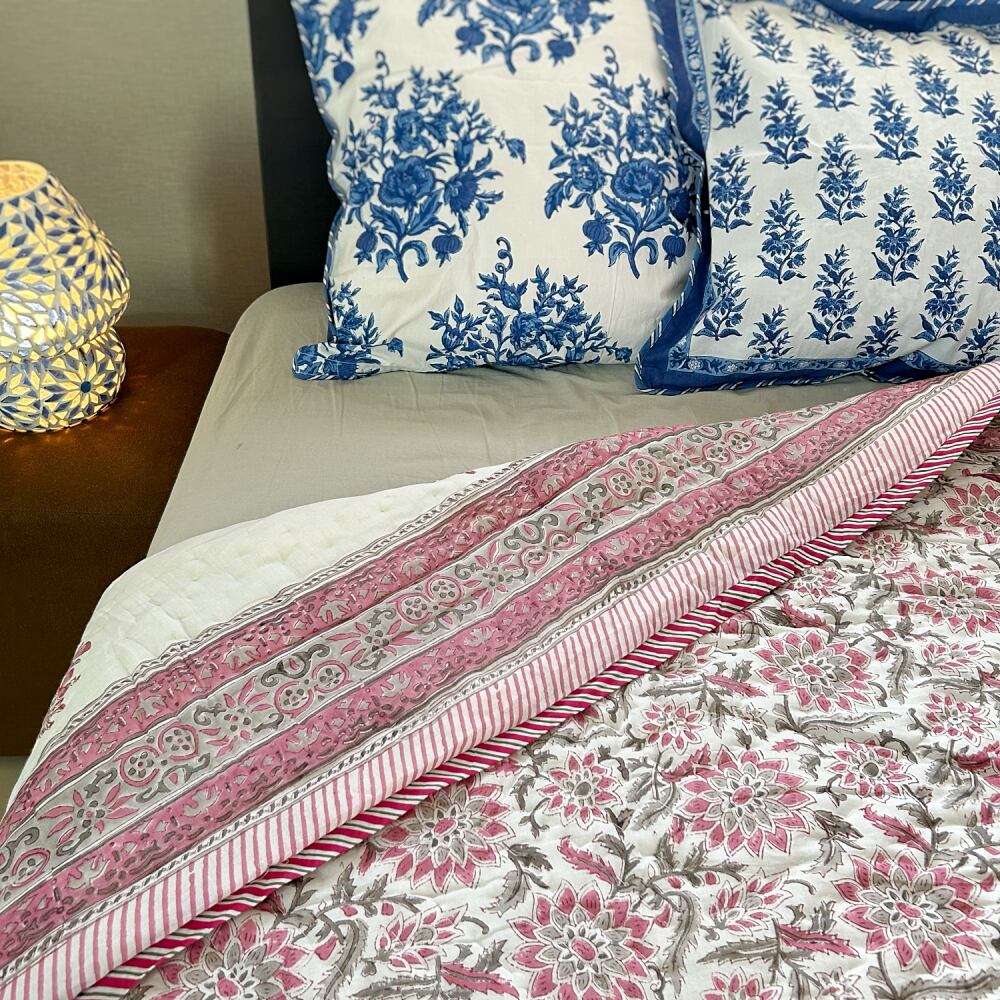 伝統的なブロックプリントで描かれた、繊細なペイズリー模様のコットンキルト。
