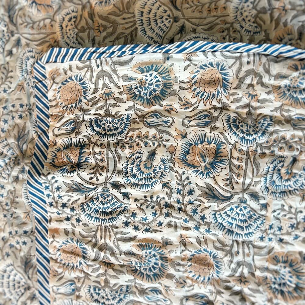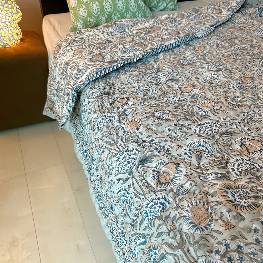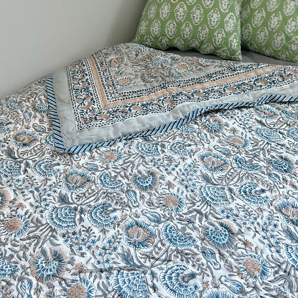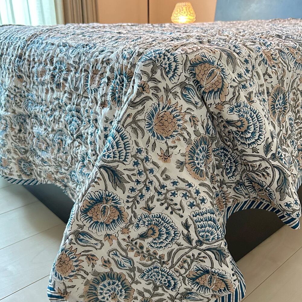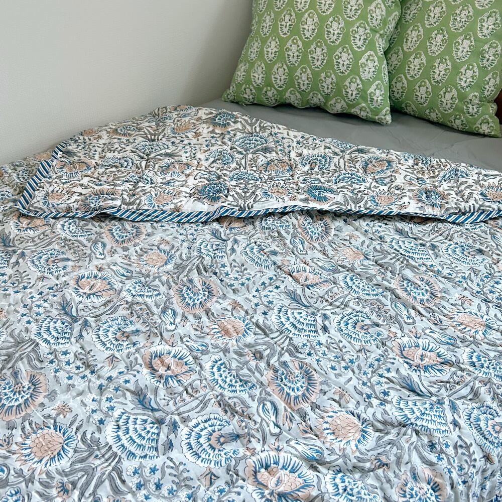 伝統的なブロックプリントで描かれた、繊細なフラワープリントのコットンキルト。