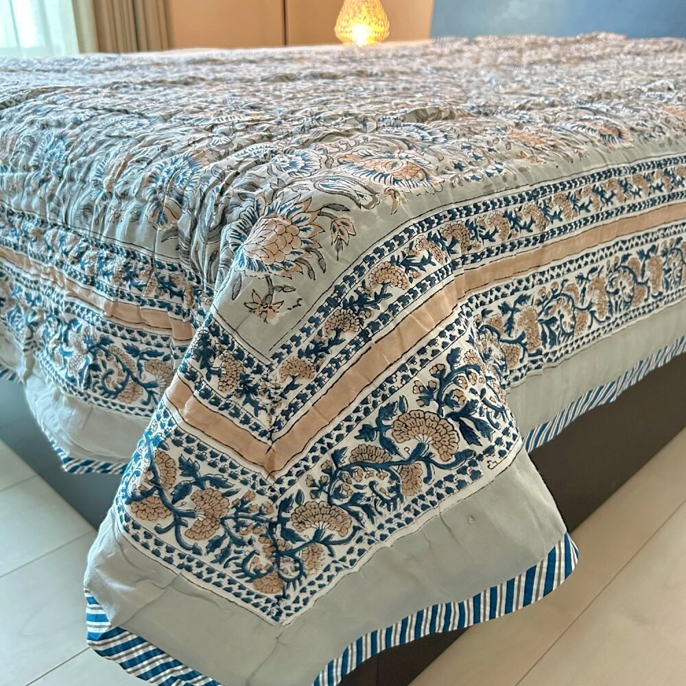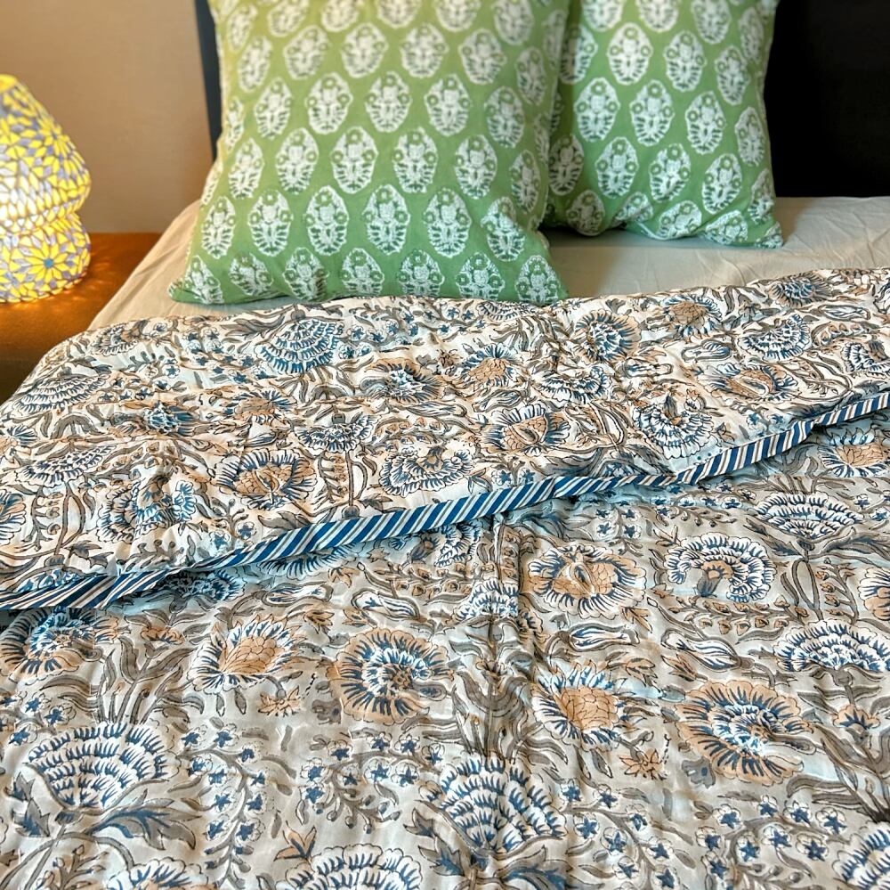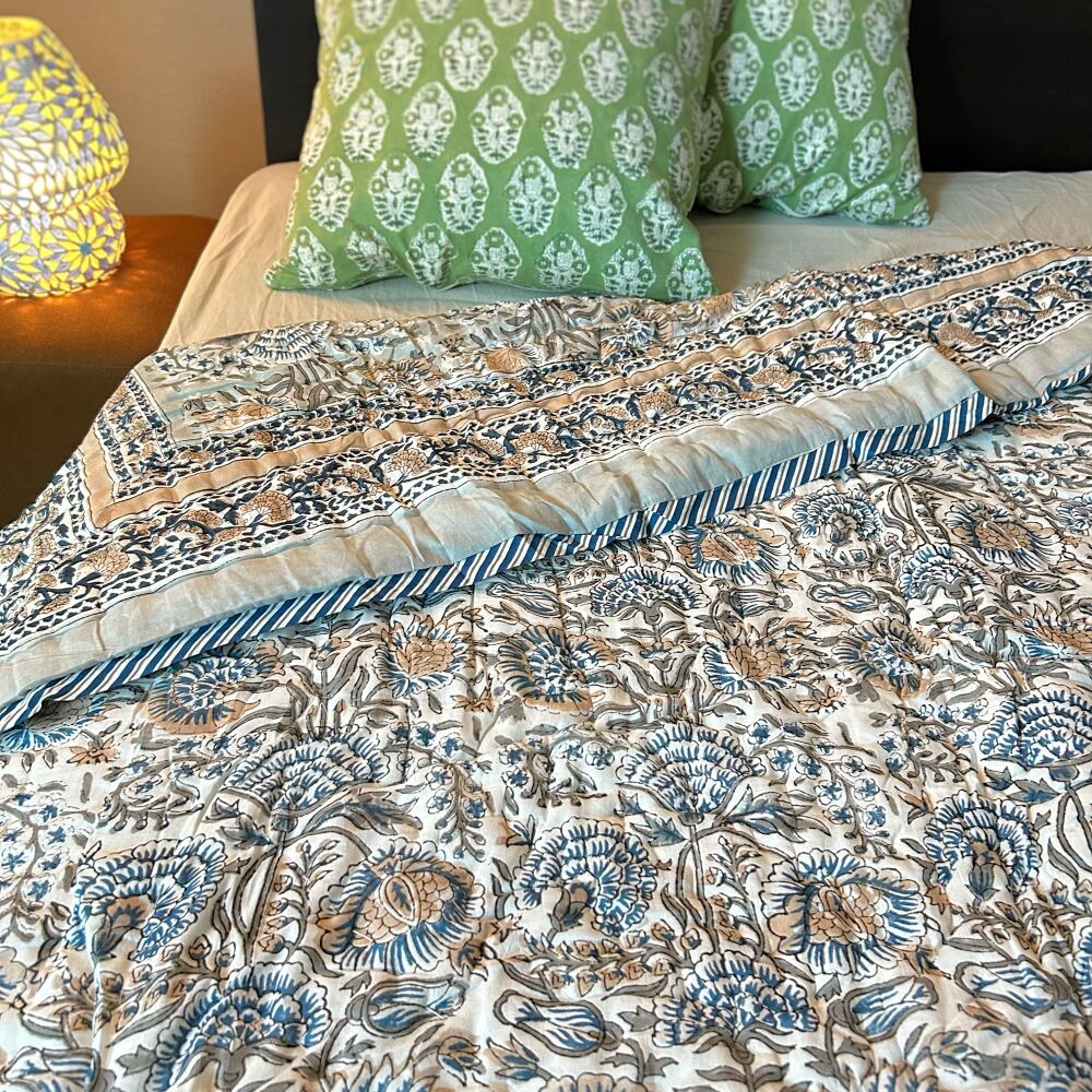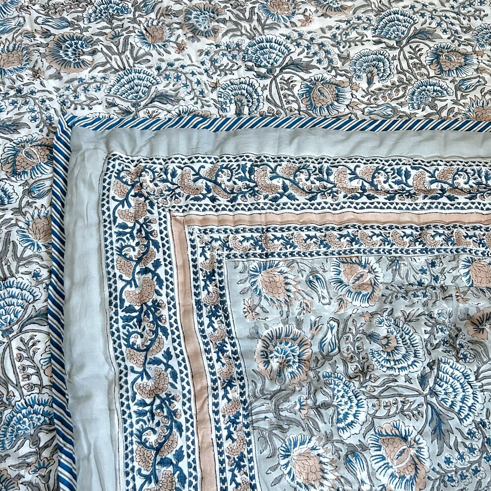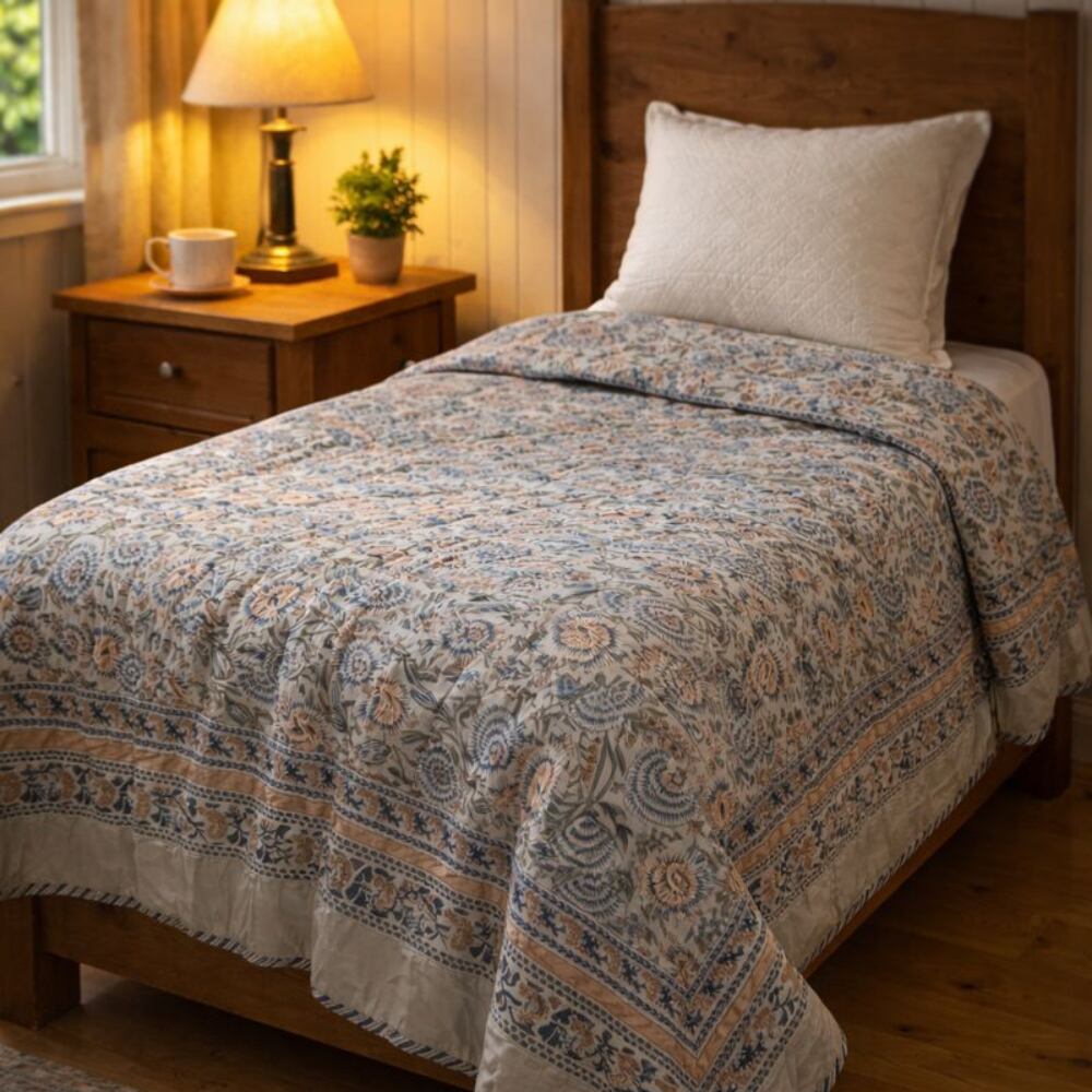 伝統的なブロックプリントで描かれた、繊細なフラワープリントのコットンキルト。