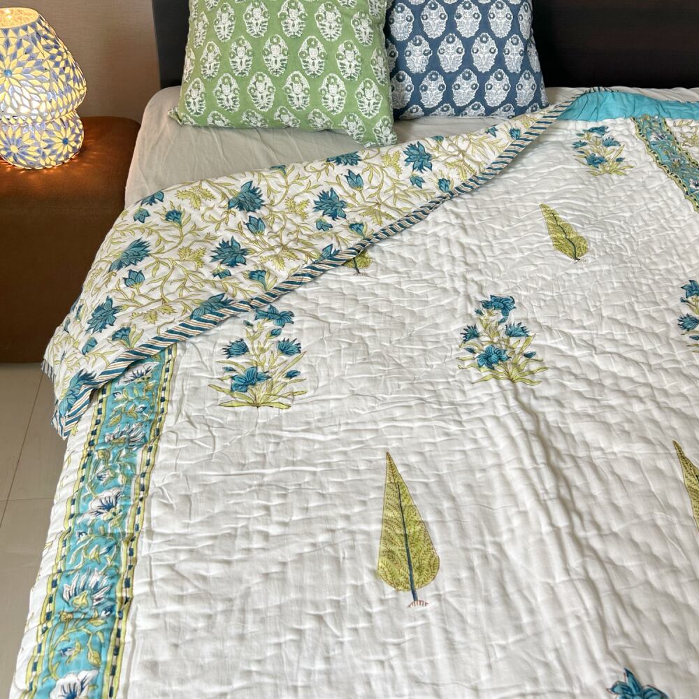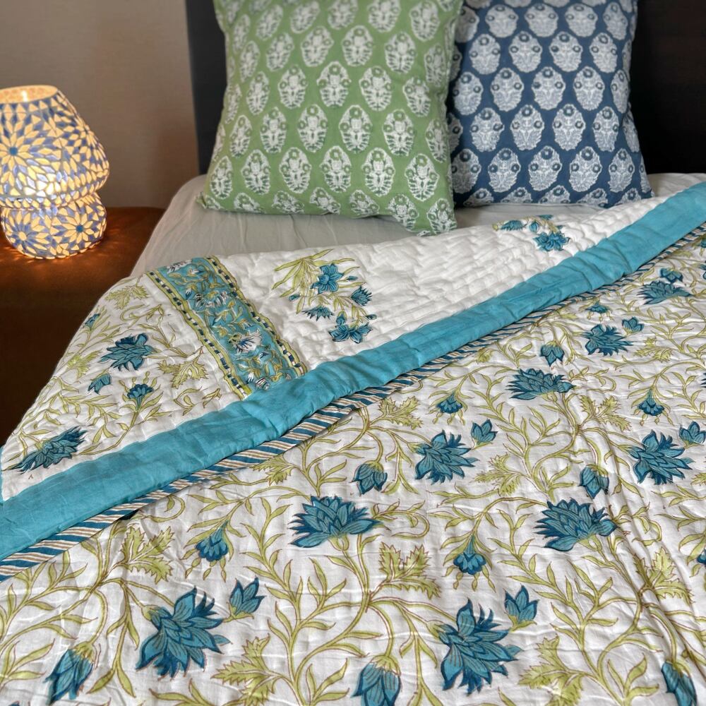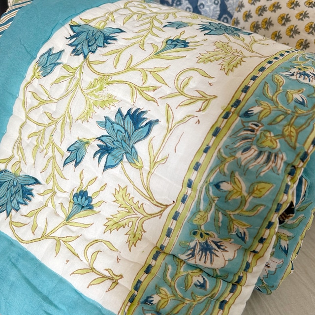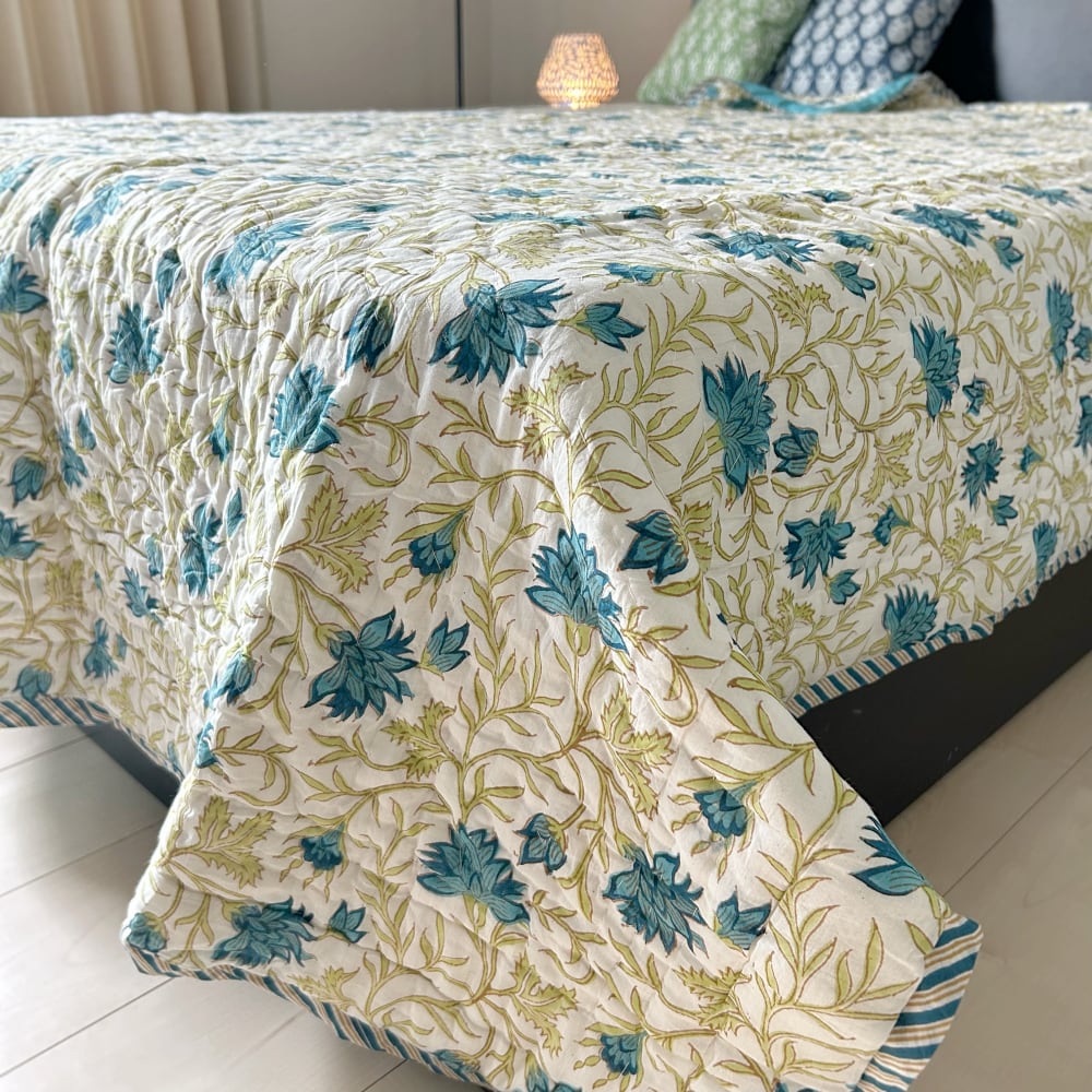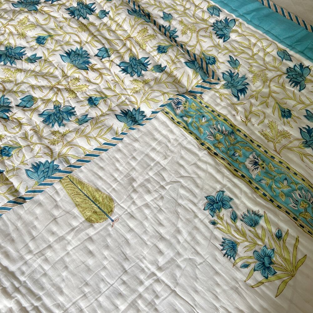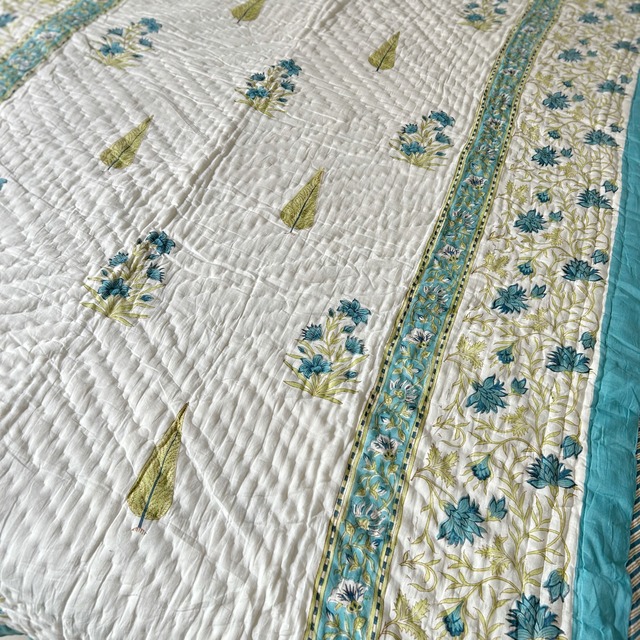 伝統的なブロックプリントで描かれた、美しいフラワープリントのコットンキルト。