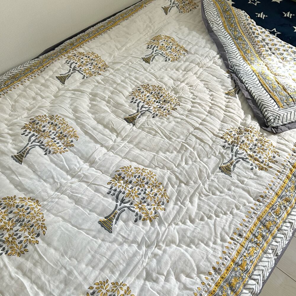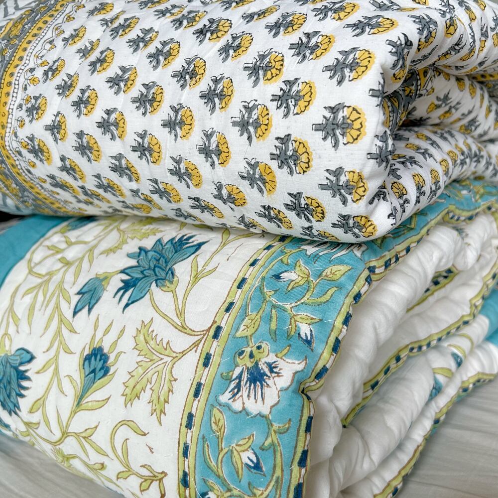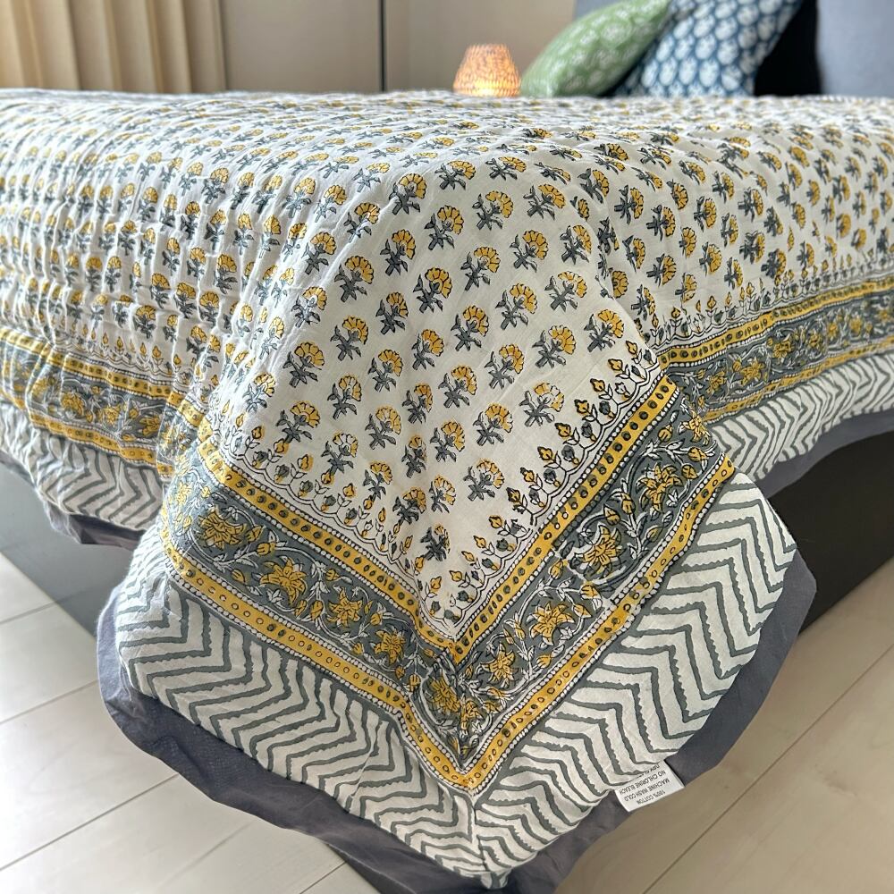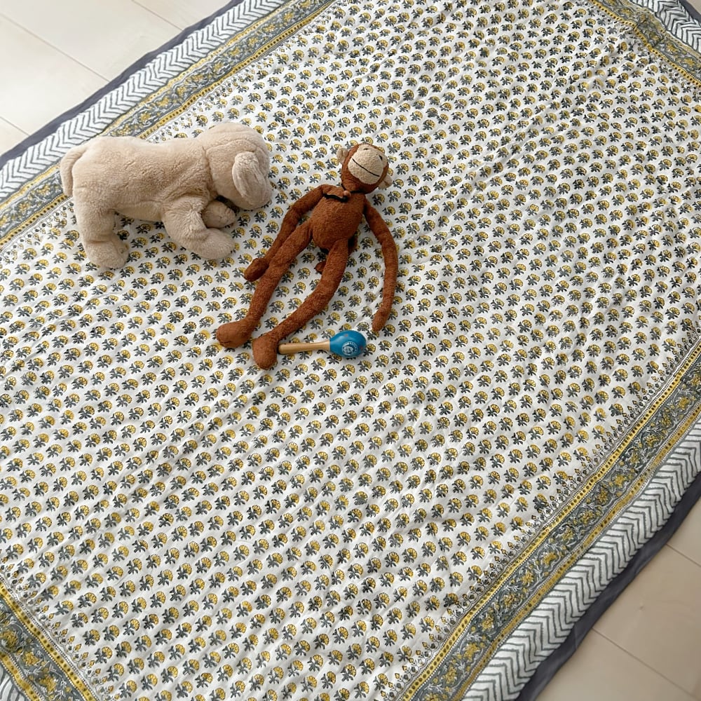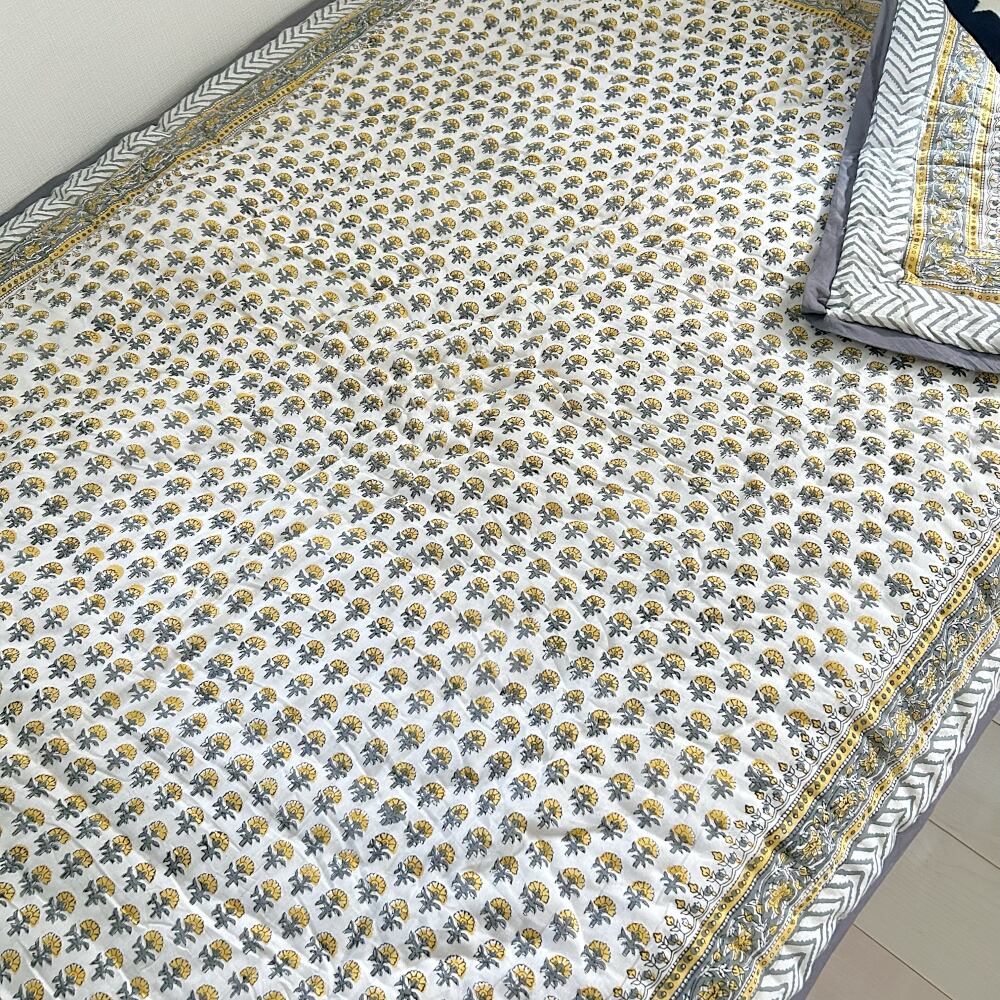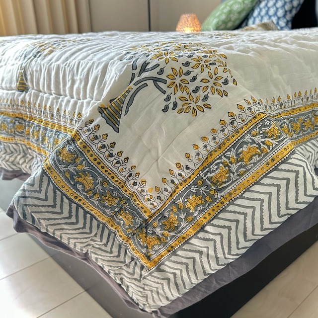 伝統的なブロックプリントで描かれた、可愛いプリントのコットンキルト。