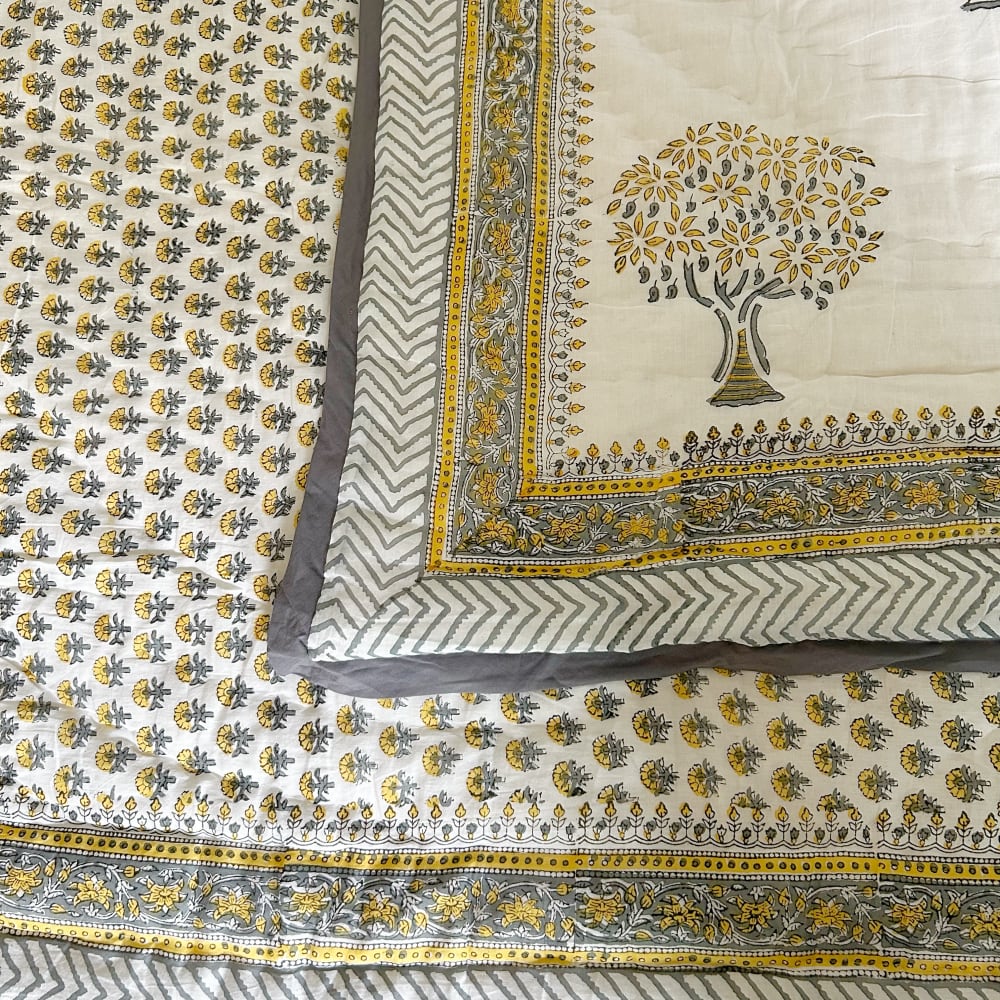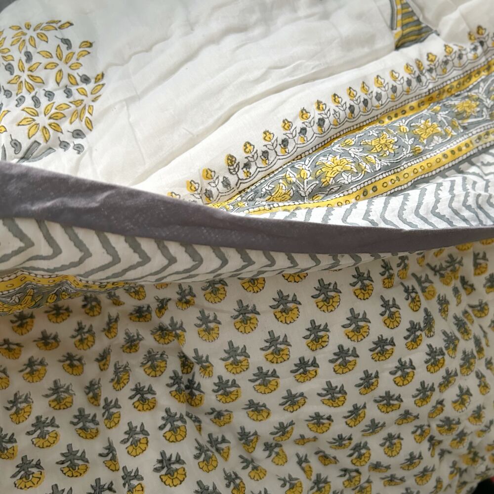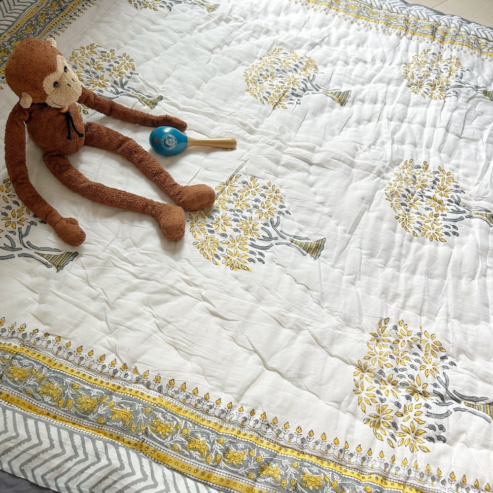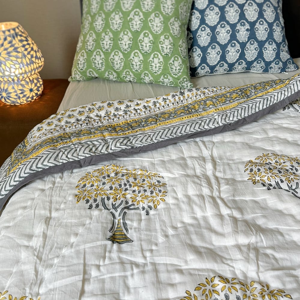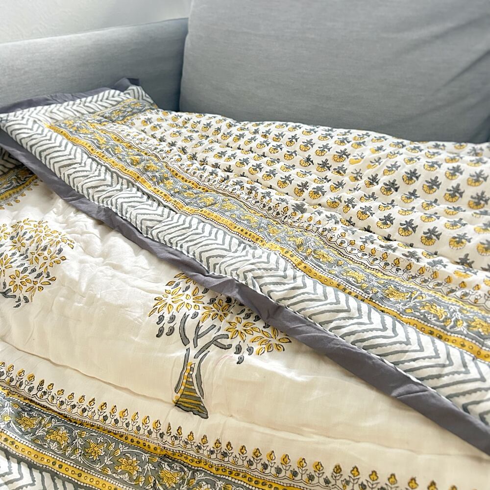 伝統的なブロックプリントで描かれた、可愛いプリントのコットンキルト。