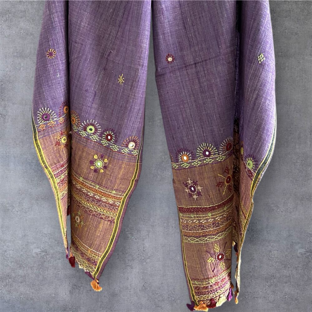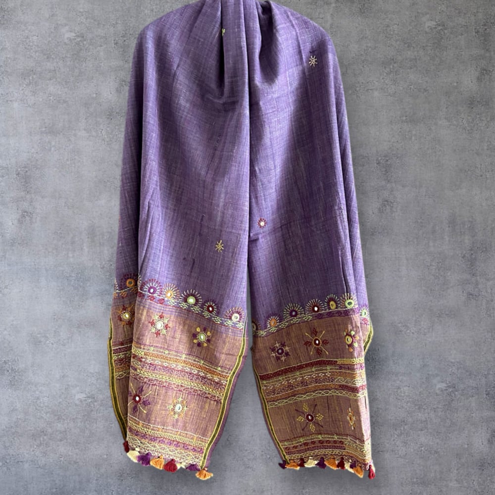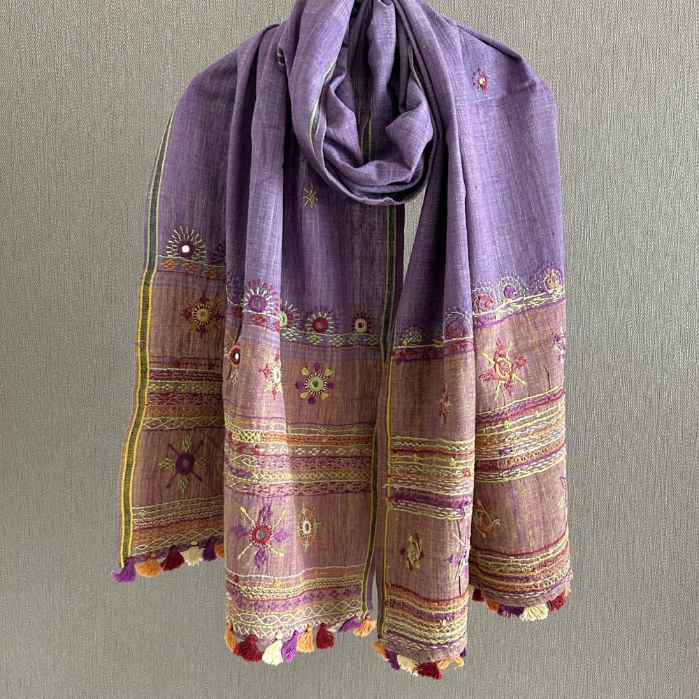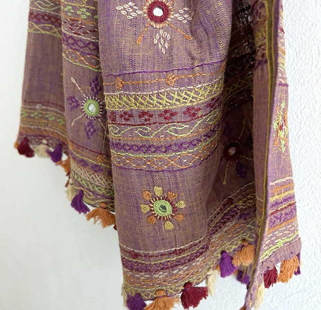 手織りならではの味わい深いコットン生地に、見事な手刺繍が施されたストール。
