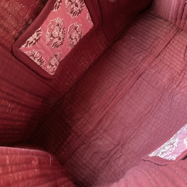 内側の両サイドにはポケットを1つずつ備え、ポケット部分には外側と同じブロックプリント生地を使用しています。