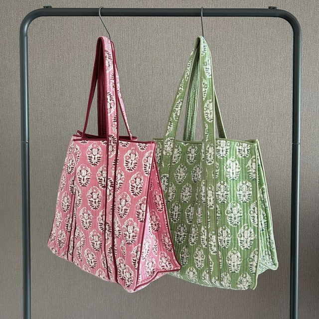 美しいハンドプリントが目を惹く、コットンキルトバッグ。
