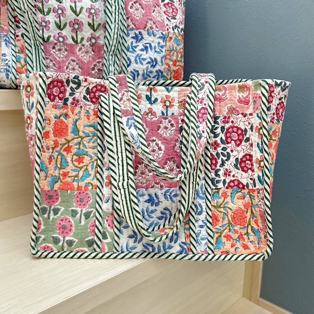 色鮮やかなブロックプリント生地をパッチワークした、コットンキルトのミニトート。