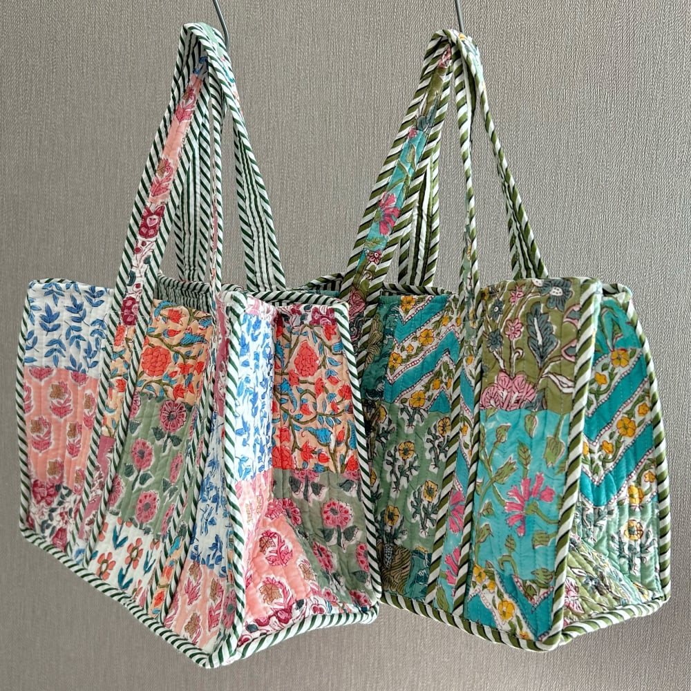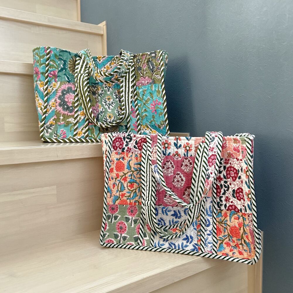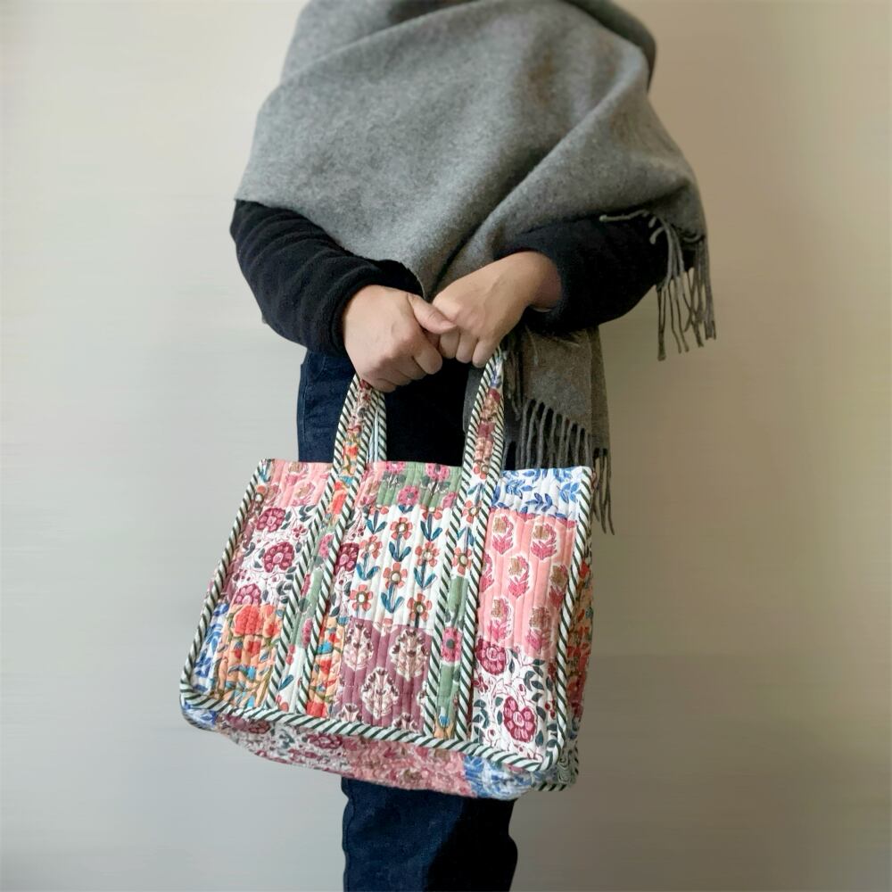 色鮮やかなブロックプリント生地をパッチワークした、コットンキルトのミニトート。