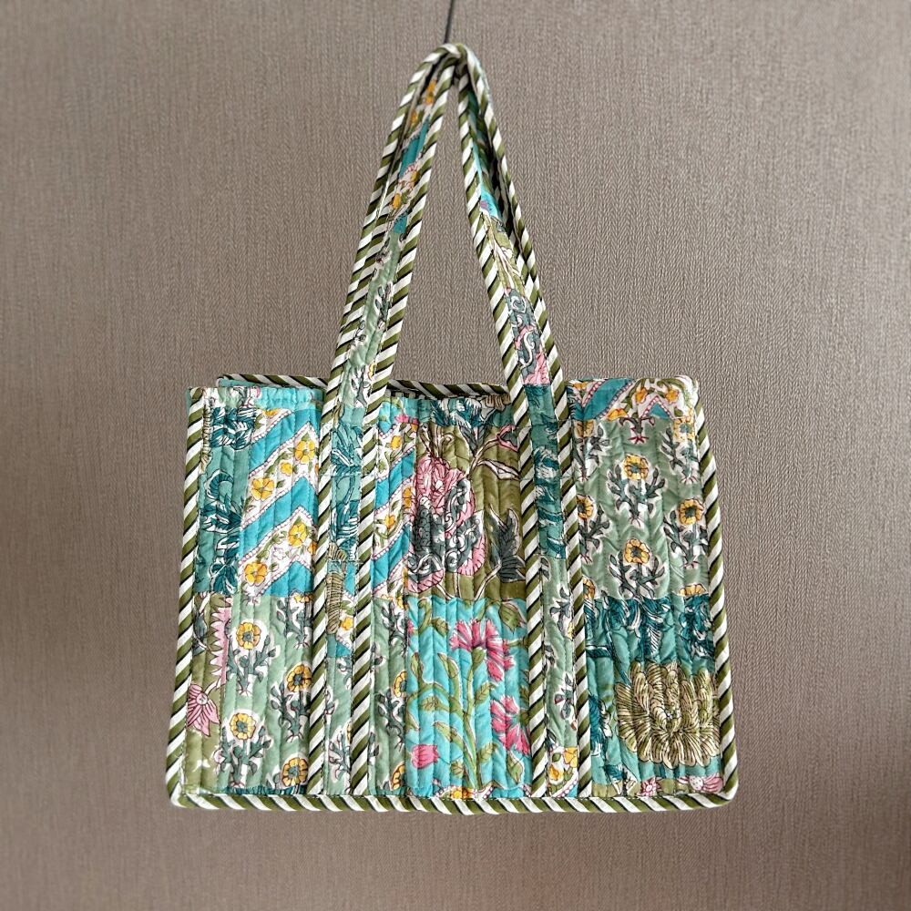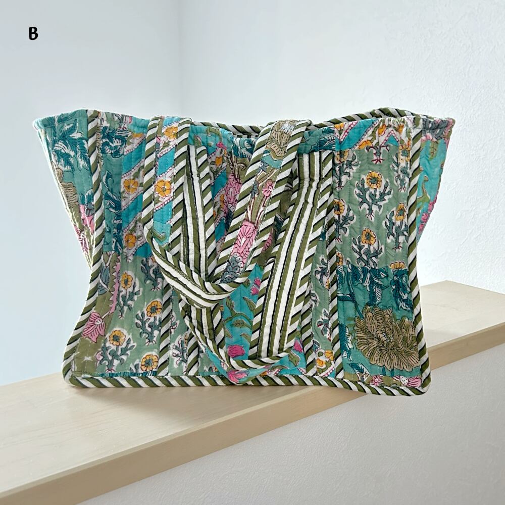 ミニトートバッグ ブロックプリント パッチワークコットンキルト ブルーグリーン