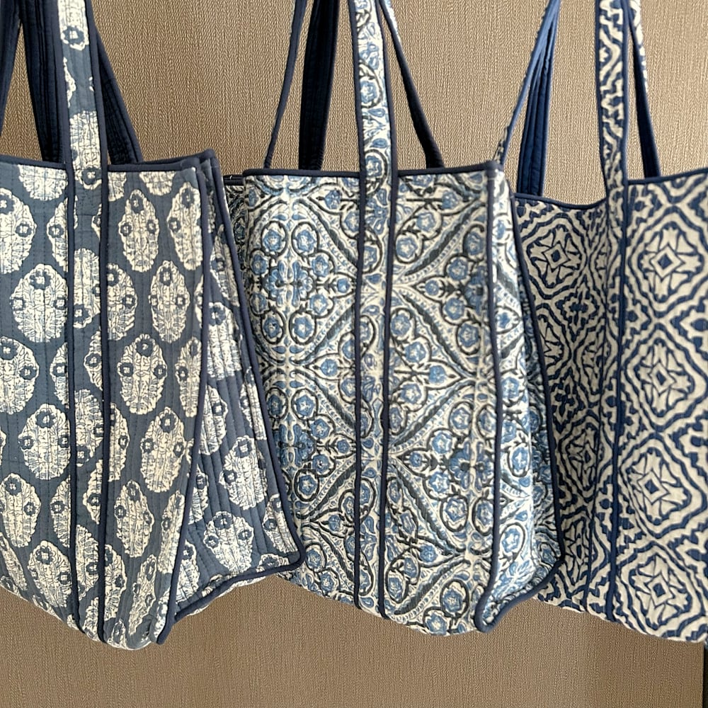 美しいハンドプリントが目を惹く、コットンキルトバッグ。