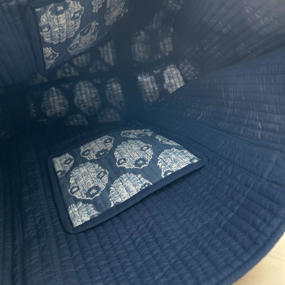 内側の両サイドにはポケットを1つずつ備え、ポケット部分には外側と同じブロックプリント生地を使用しています。