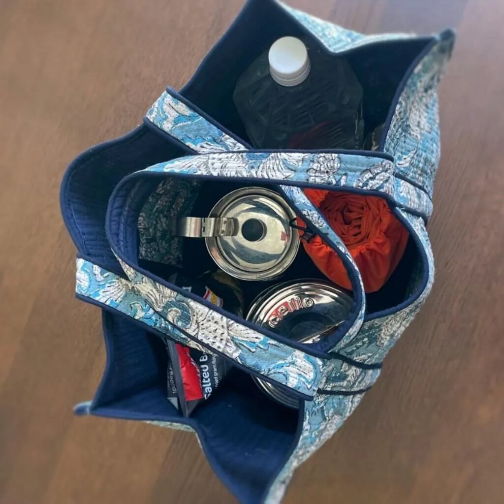 大きめサイズながら、厚みのある生地を2枚重ね、綿を入れて仕立てたキルト生地を使用しています。しっかりとした丈夫なつくりで、お買い物はもちろん、ピクニックやお子さまとのお出かけにも活躍します。