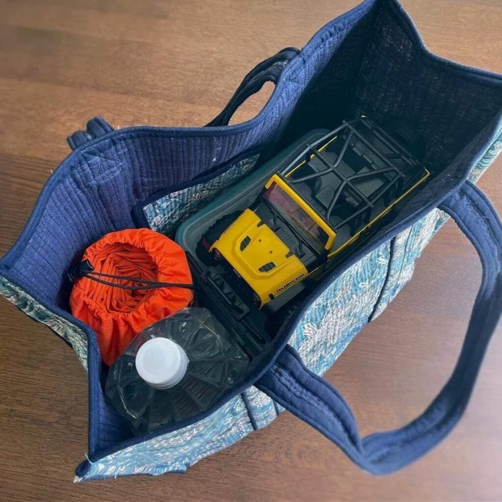 大きめサイズながら、厚みのある生地を2枚重ね、綿を入れて仕立てたキルト生地を使用しています。しっかりとした丈夫なつくりで、お買い物はもちろん、ピクニックやお子さまとのお出かけにも活躍します。
