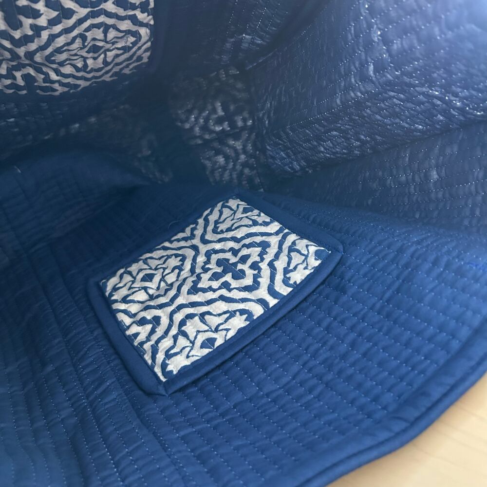 内側の両サイドにはポケットを1つずつ備え、ポケット部分には外側と同じブロックプリント生地を使用しています。