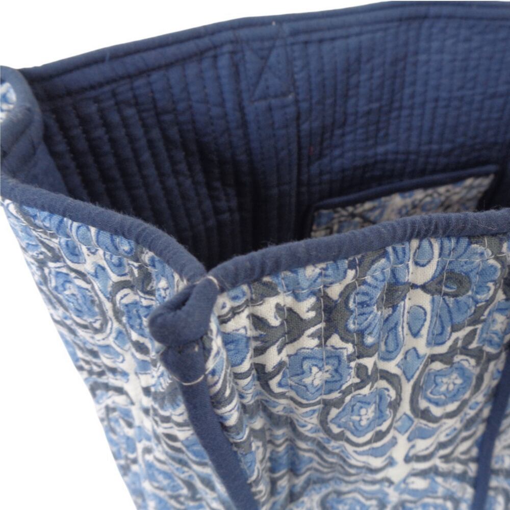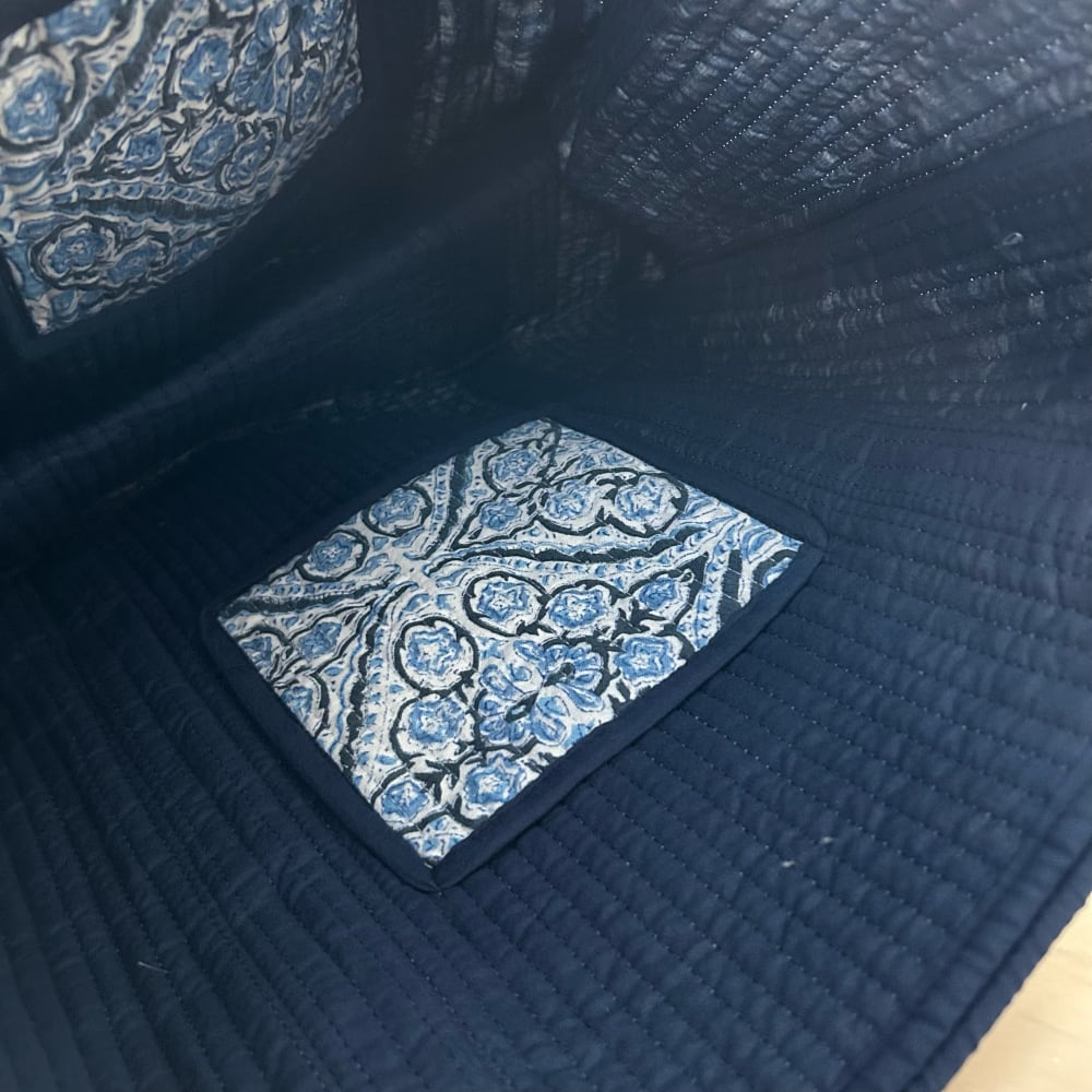 内側の両サイドにはポケットを1つずつ備え、ポケット部分には外側と同じブロックプリント生地を使用しています。