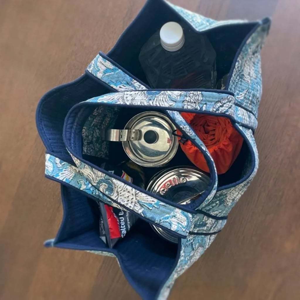 大きめサイズながら、厚みのある生地を2枚重ね、綿を入れて仕立てたキルト生地を使用しています。しっかりとした丈夫なつくりで、お買い物はもちろん、ピクニックやお子さまとのお出かけにも活躍します。