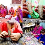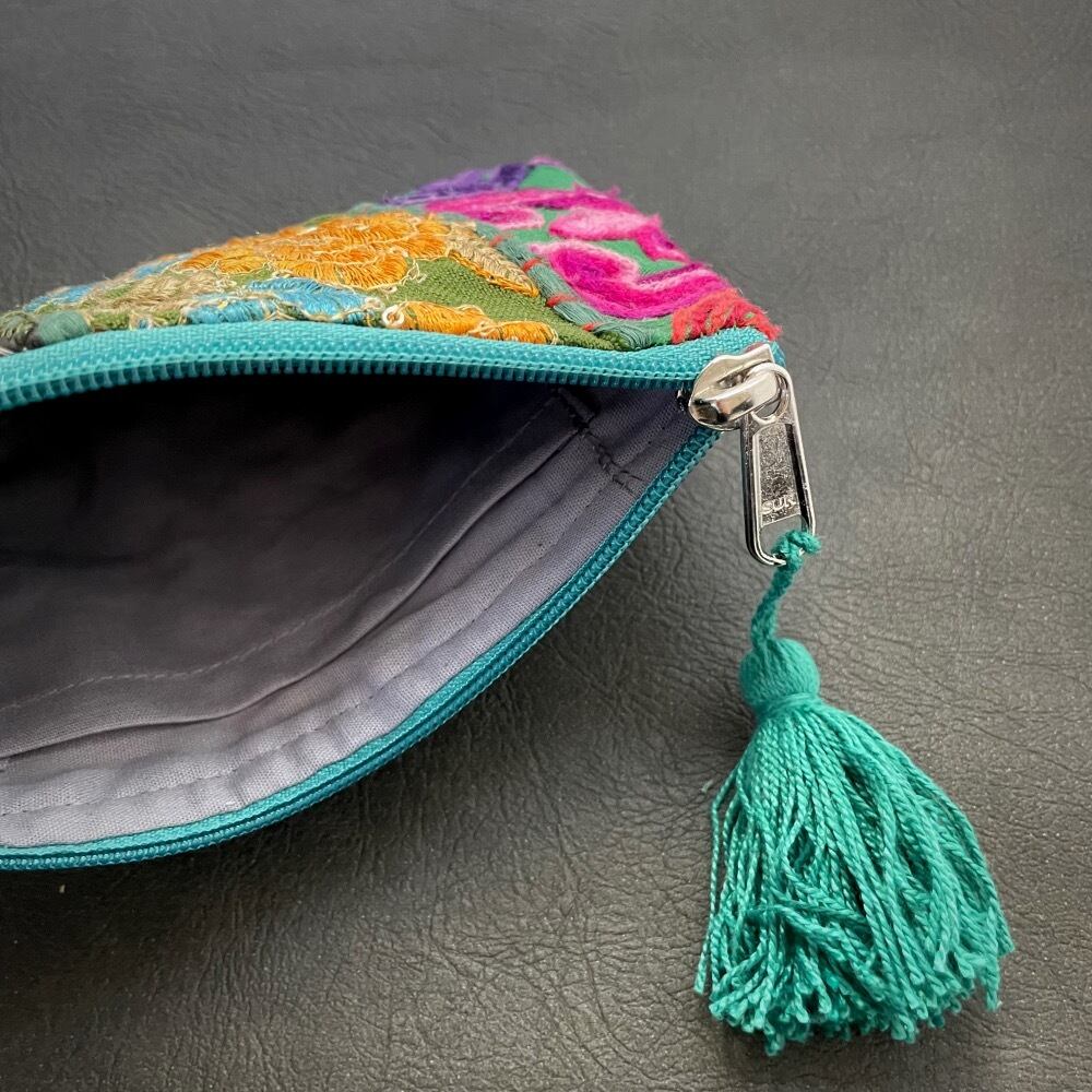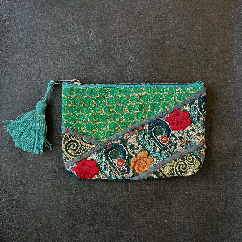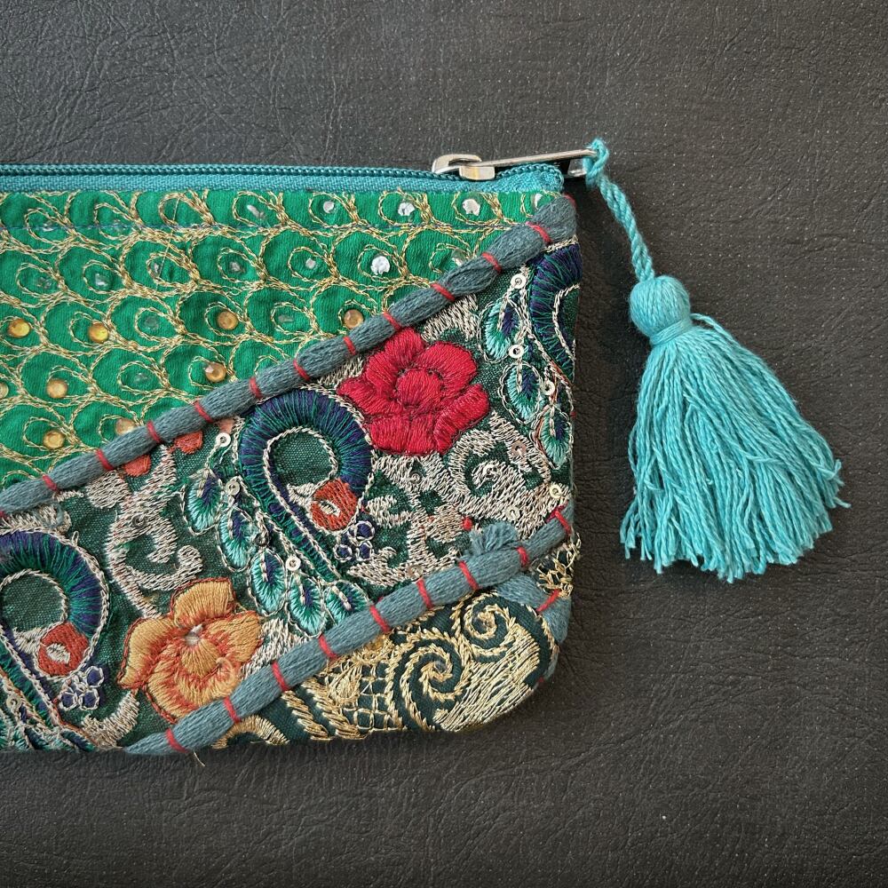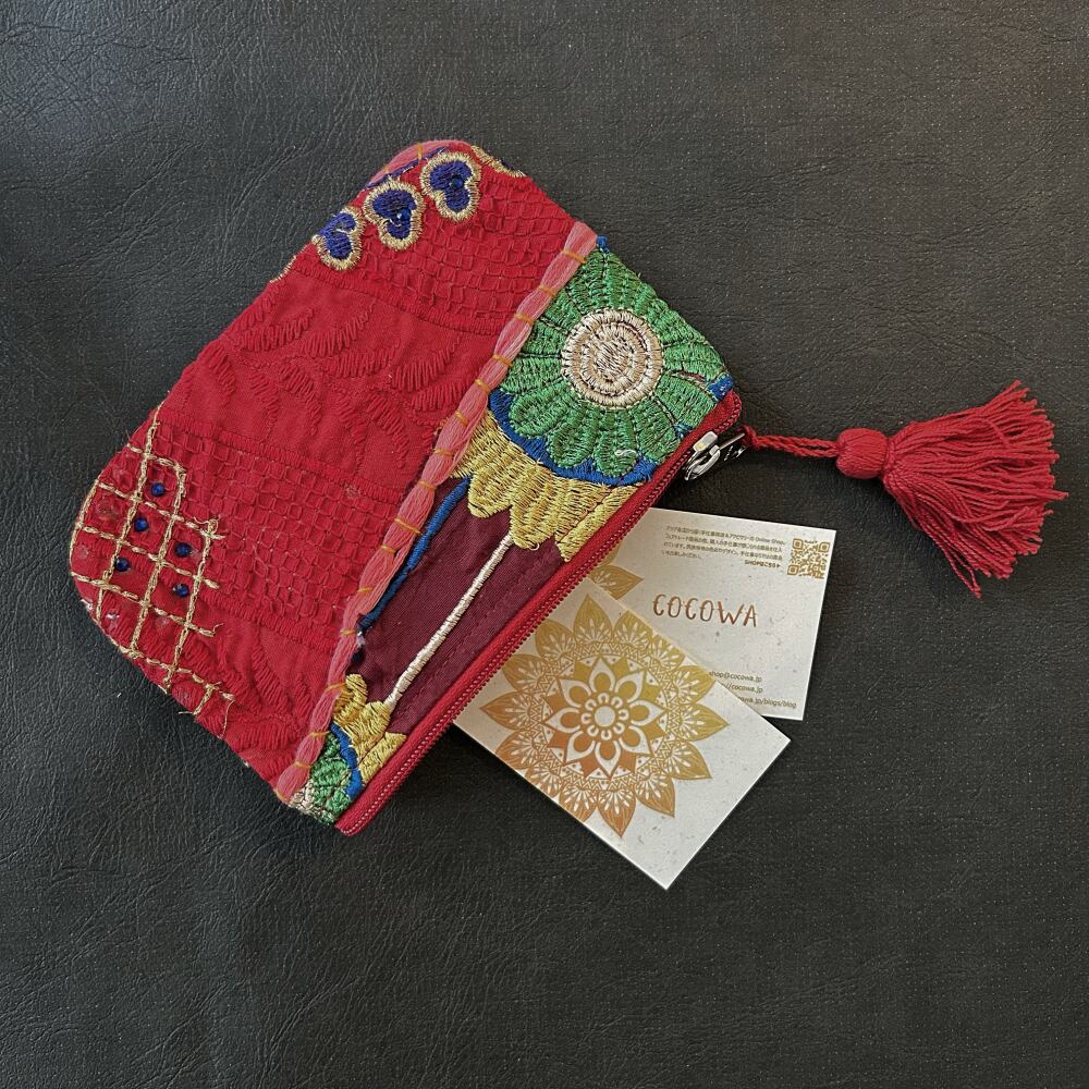 サリーなどの美しい生地を再利用し、刺繍やパッチワークによって新たな価値を生み出しています。リサイクル生地の特性上、多少の色あせや小さな傷が見られる場合がございますが、それも素材の個性としてご理解ください。