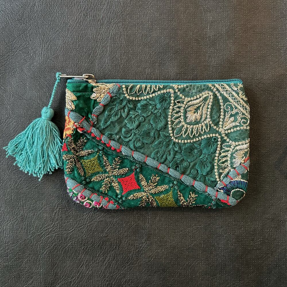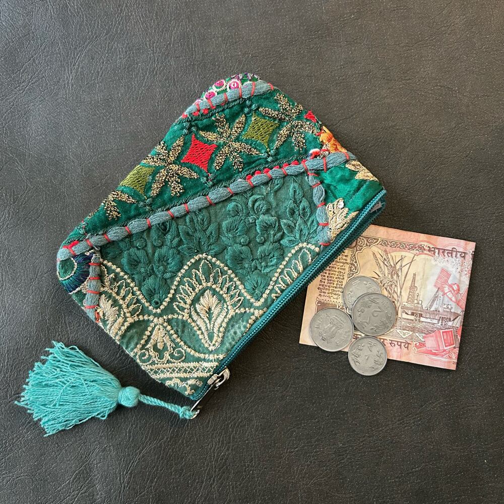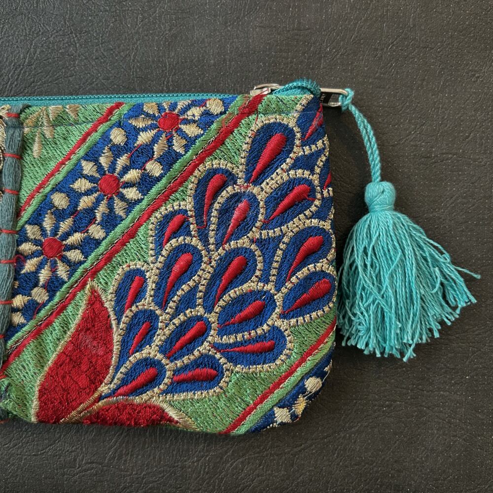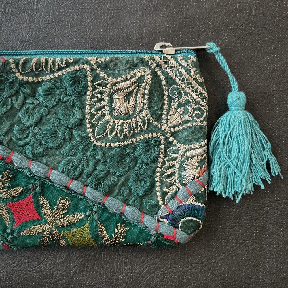 サリーなどの美しい生地を再利用し、刺繍やパッチワークによって新たな価値を生み出しています。リサイクル生地の特性上、多少の色あせや小さな傷が見られる場合がございますが、それも素材の個性としてご理解ください。