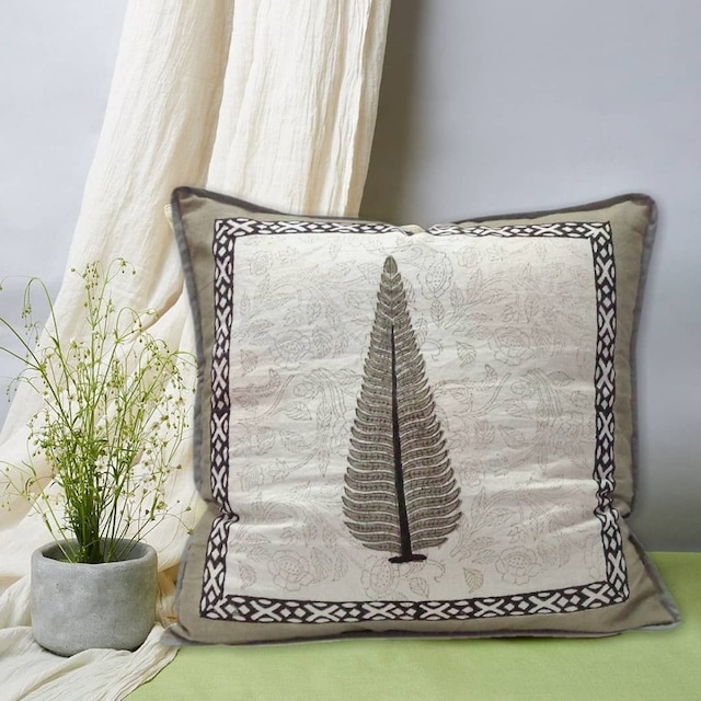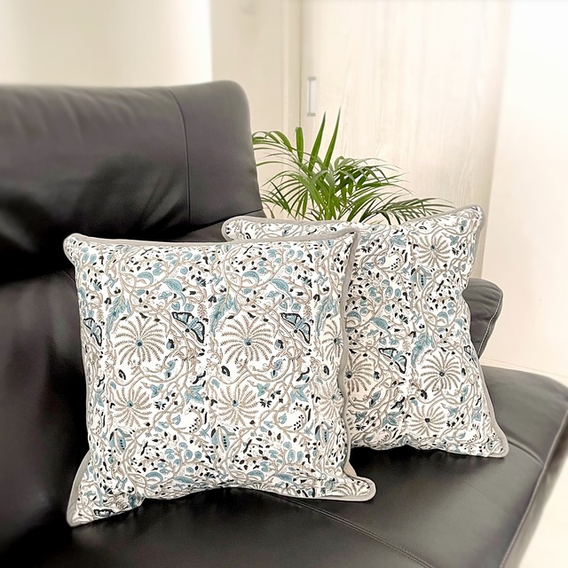 インド・ジャイプール地方で作られた、ブロックプリントのクッションカバー。